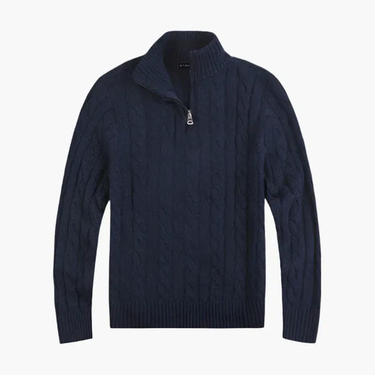 Herr – stickad halvzip-polo – klassisk kabelstickad stil