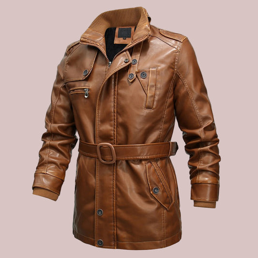 Herrjacka i Päls – Skräddad Passform – Läderlook – Bälte – Dragkedja Fram – Fodrad