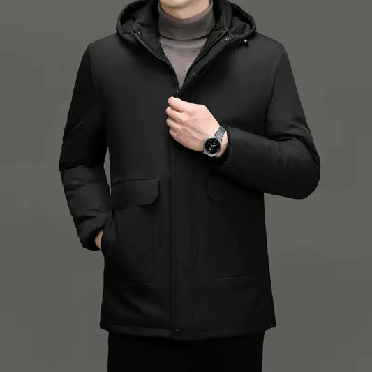 Herrjacka med huva – Vadderad – Vindavvisande – Normal passform – Höftlång