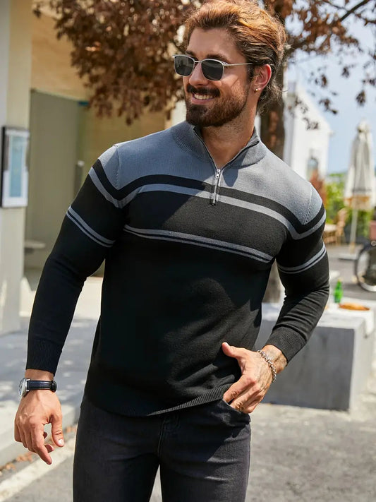 Trendig Randig Halvdragkedja Tröja Med Ribbad Manschett Och Fåll För Herr | Perfekt för Höst/Vinter
