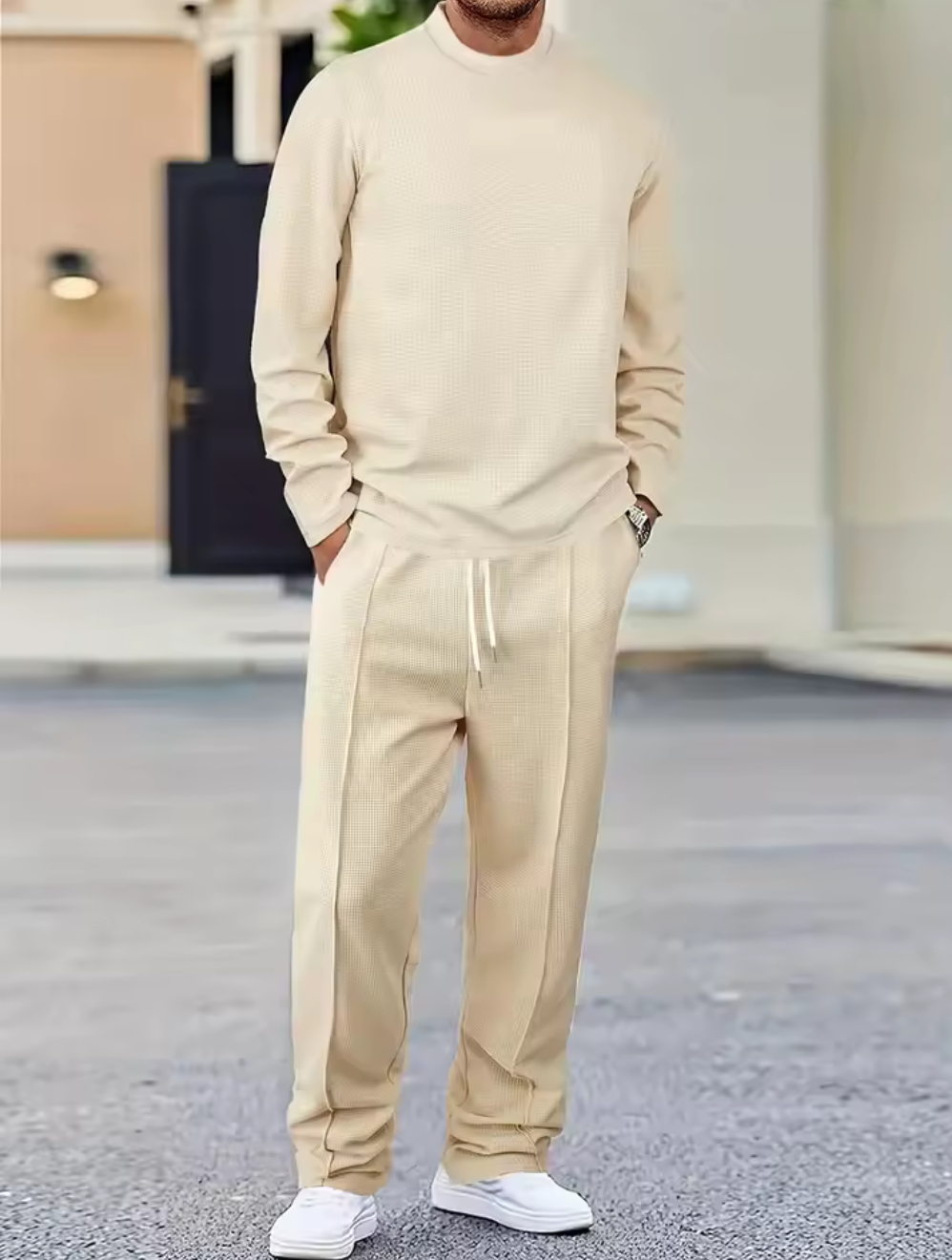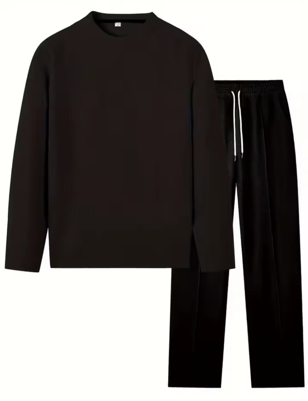 Detta 2-delade set med långärmad tröja och matchande byxor är det perfekta valet för dig som vill kombinera stil med komfort. Setet är tillverkat i ett mjukt, stretchigt material med en subtil textur som ger ett exklusivt intryck. Perfekt för både hemmabruk och avslappnade vardagslooks – addera ett par sneakers så är du good to go.