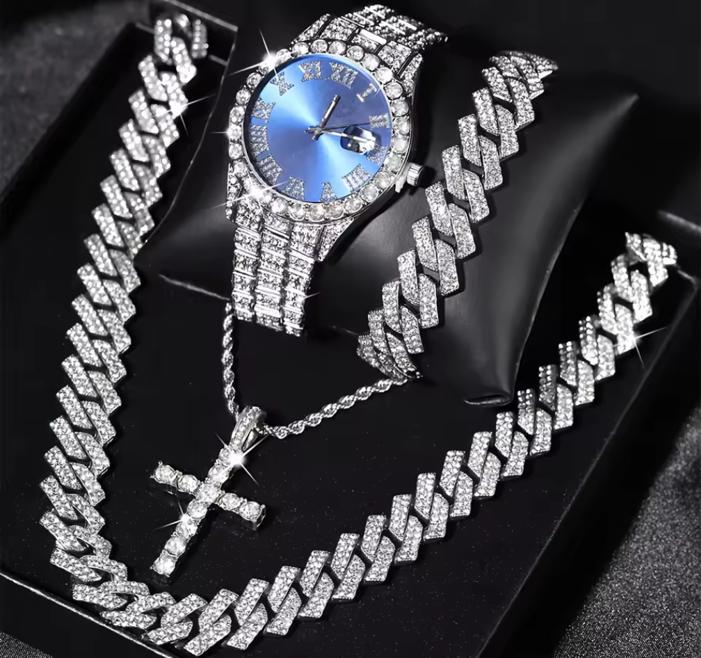 Maxa din look med detta kompletta bling-set för dig som vill ha allt. Setet innehåller en gnistrande herrklocka med blå urtavla, ett armband i cuban chain-design, en matchande halskedja och ett hängsmycke i form av ett kristallkors – allt i glittrande silverfinish.
