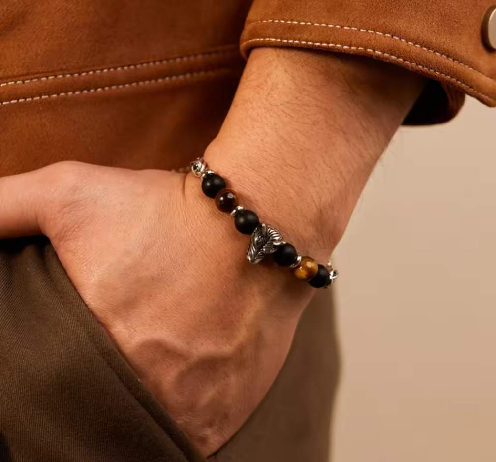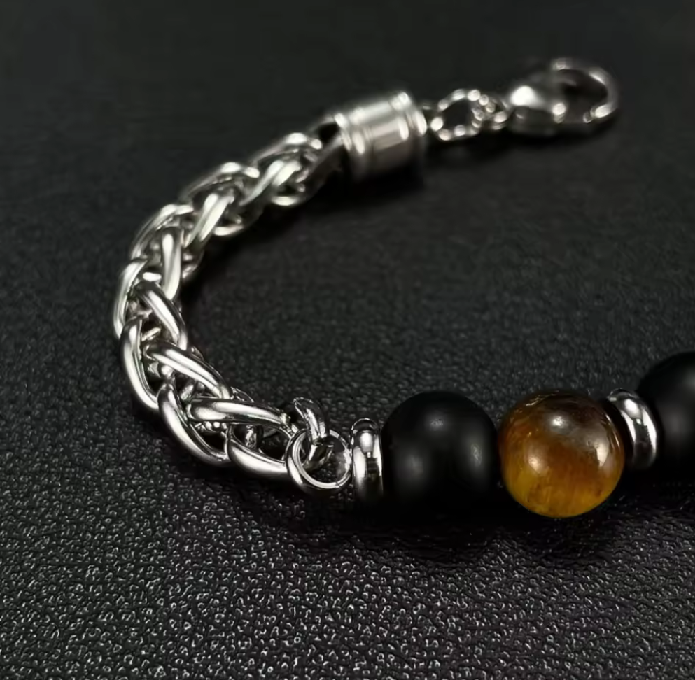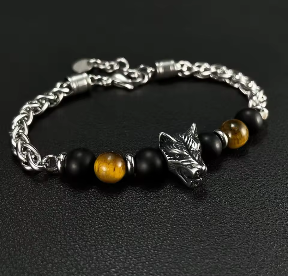 Uttryck styrka, visdom och individualitet med detta kraftfulla armband i stål och naturliga stenar. Kombinationen av flätad kedja, svarta lavastenar, tigeröga-pärlor och ett detaljerat varghuvud i metall gör detta till mer än bara ett smycke – det är en symbol.