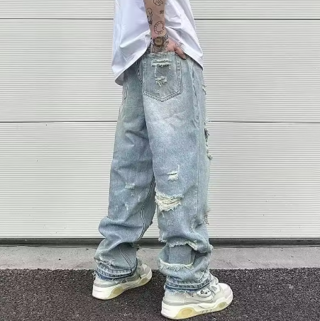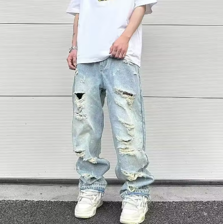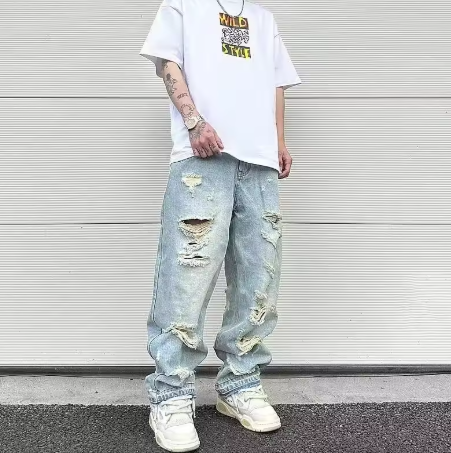 Dessa ljusa baggy jeans är både stiliga och bekväma, med en avslappnad passform och slitna detaljer som ger dem ett klassiskt, trendigt utseende. Perfekta för att skapa en modern, streetwear-inspirerad look.