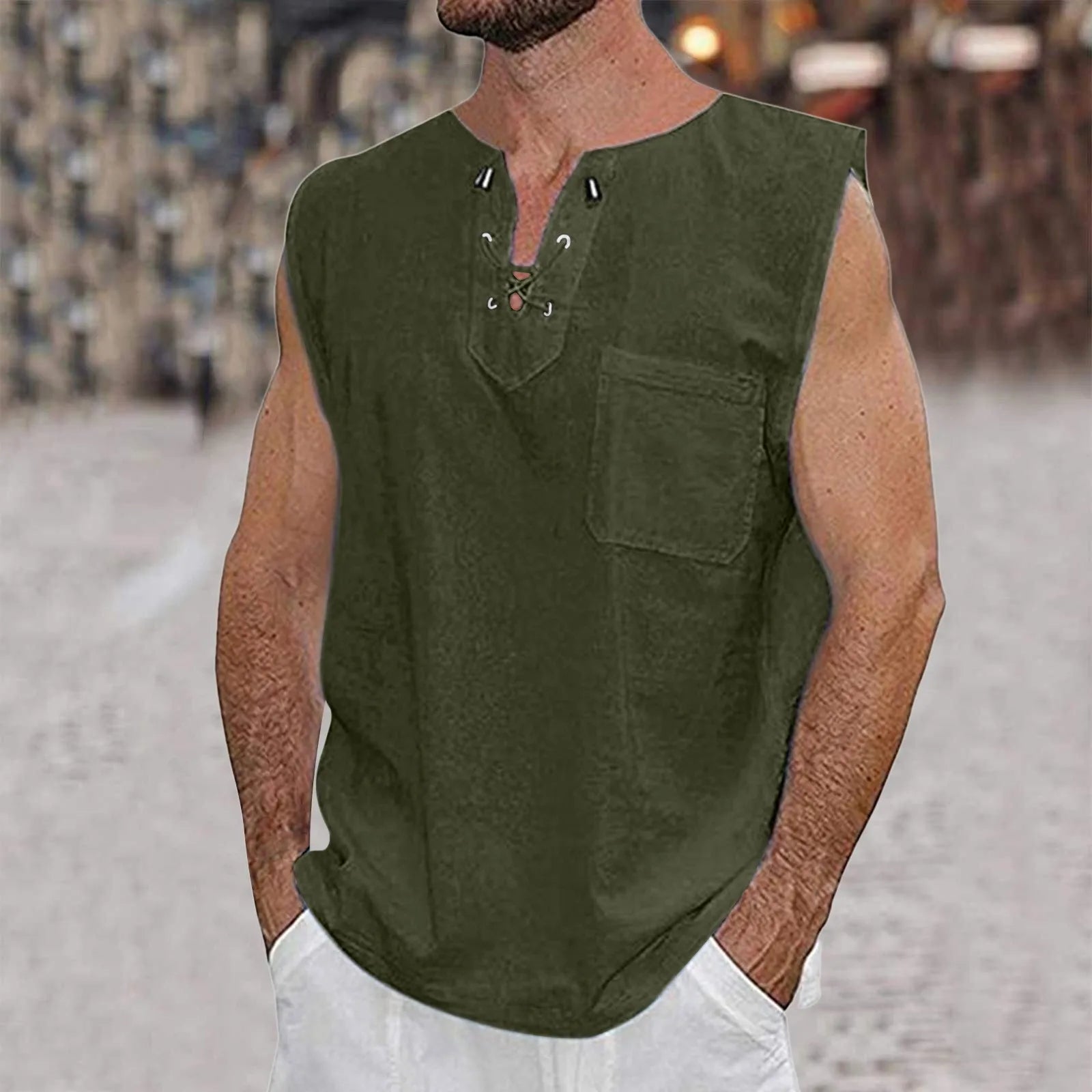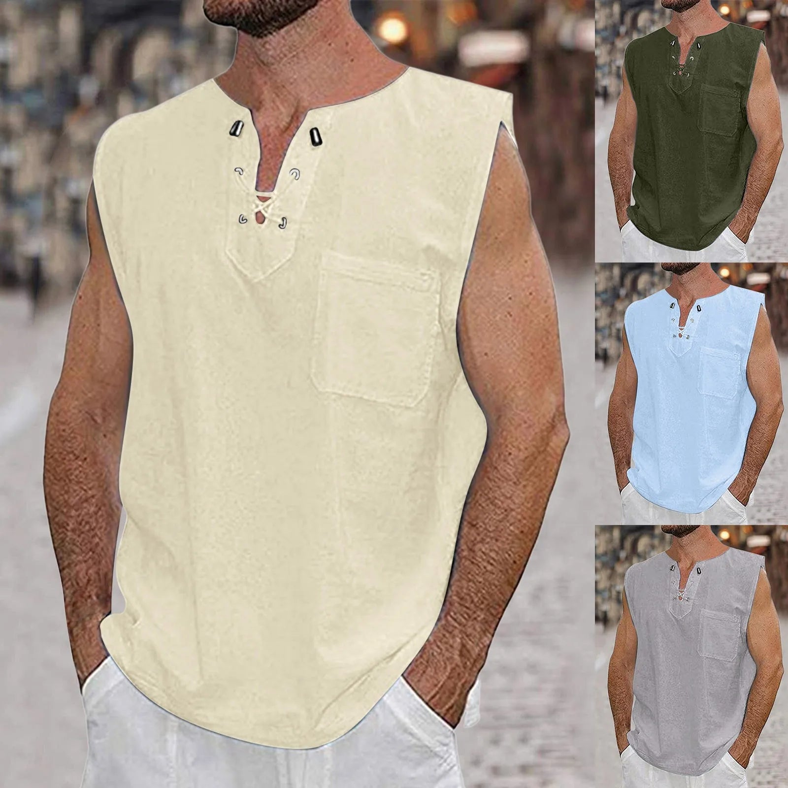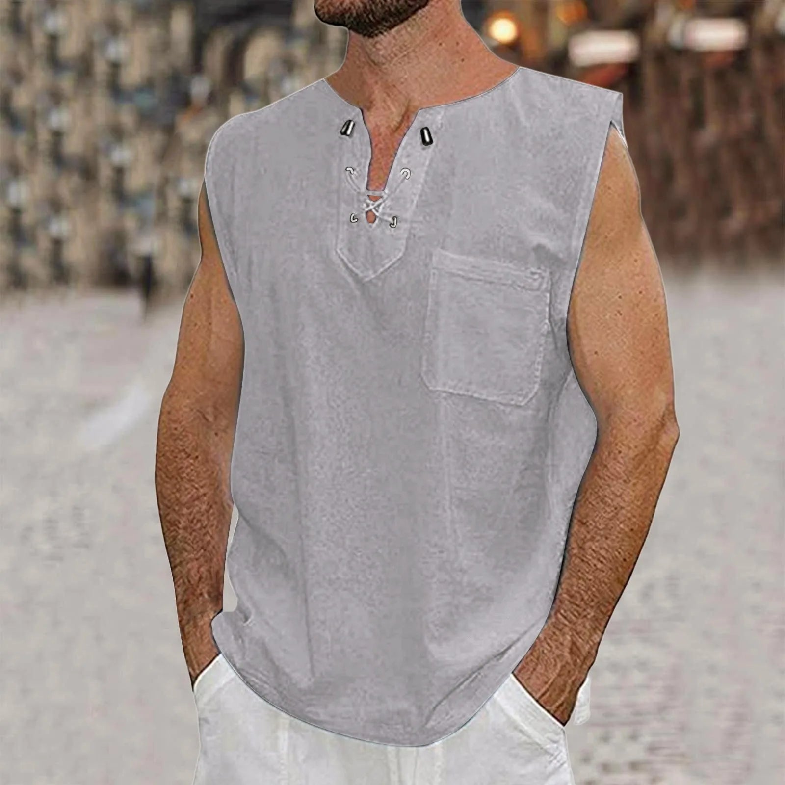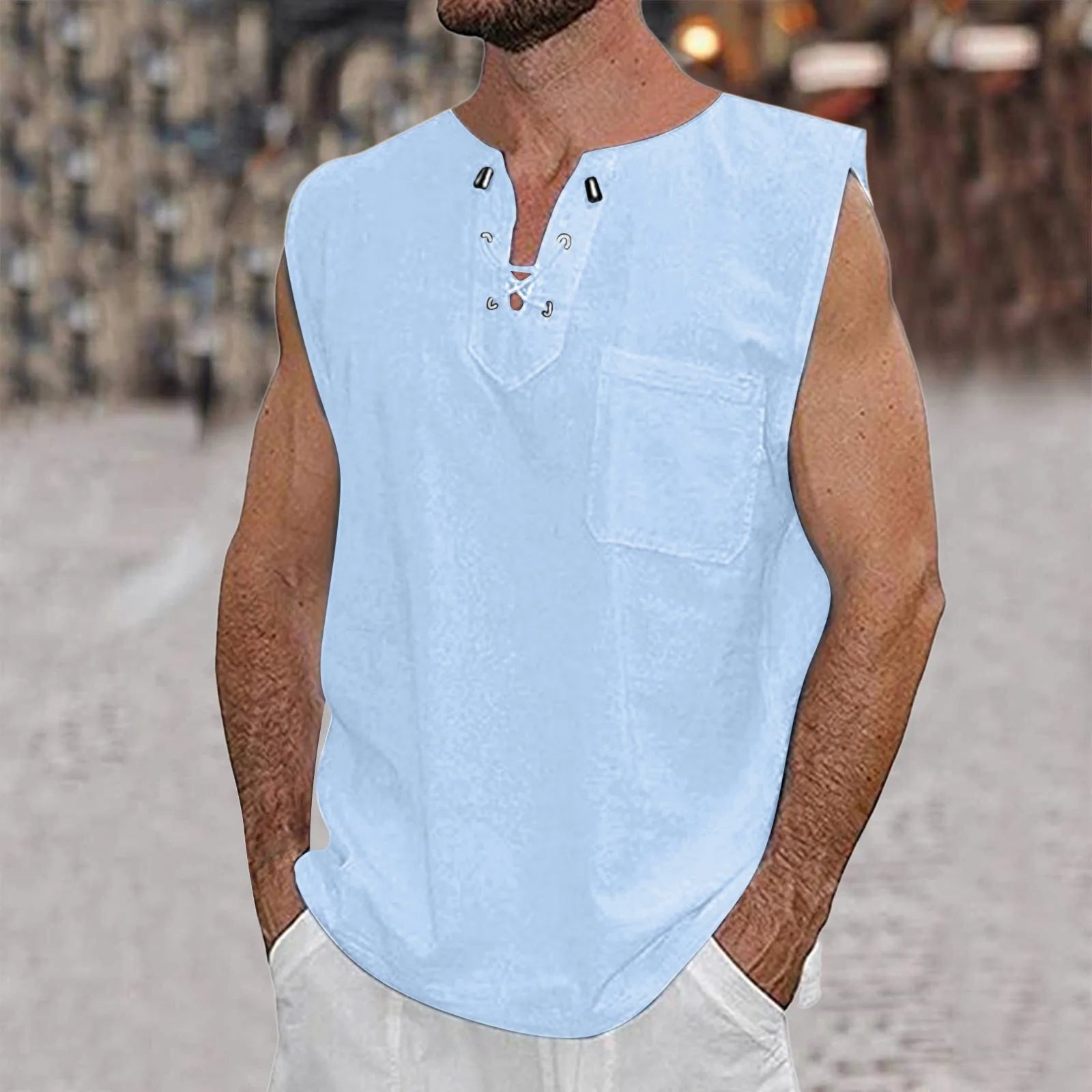 Claes ärmlös sommarskjorta i bomull/linne för män kombinerar en avslappnad passform med en andningsbar blandning av bomull och linne. Den är designad för att ge ett skarpt, modernt utseende i varmt väder och säkerställer rörelsefrihet med sin lätta, ärmlösa konstruktion.