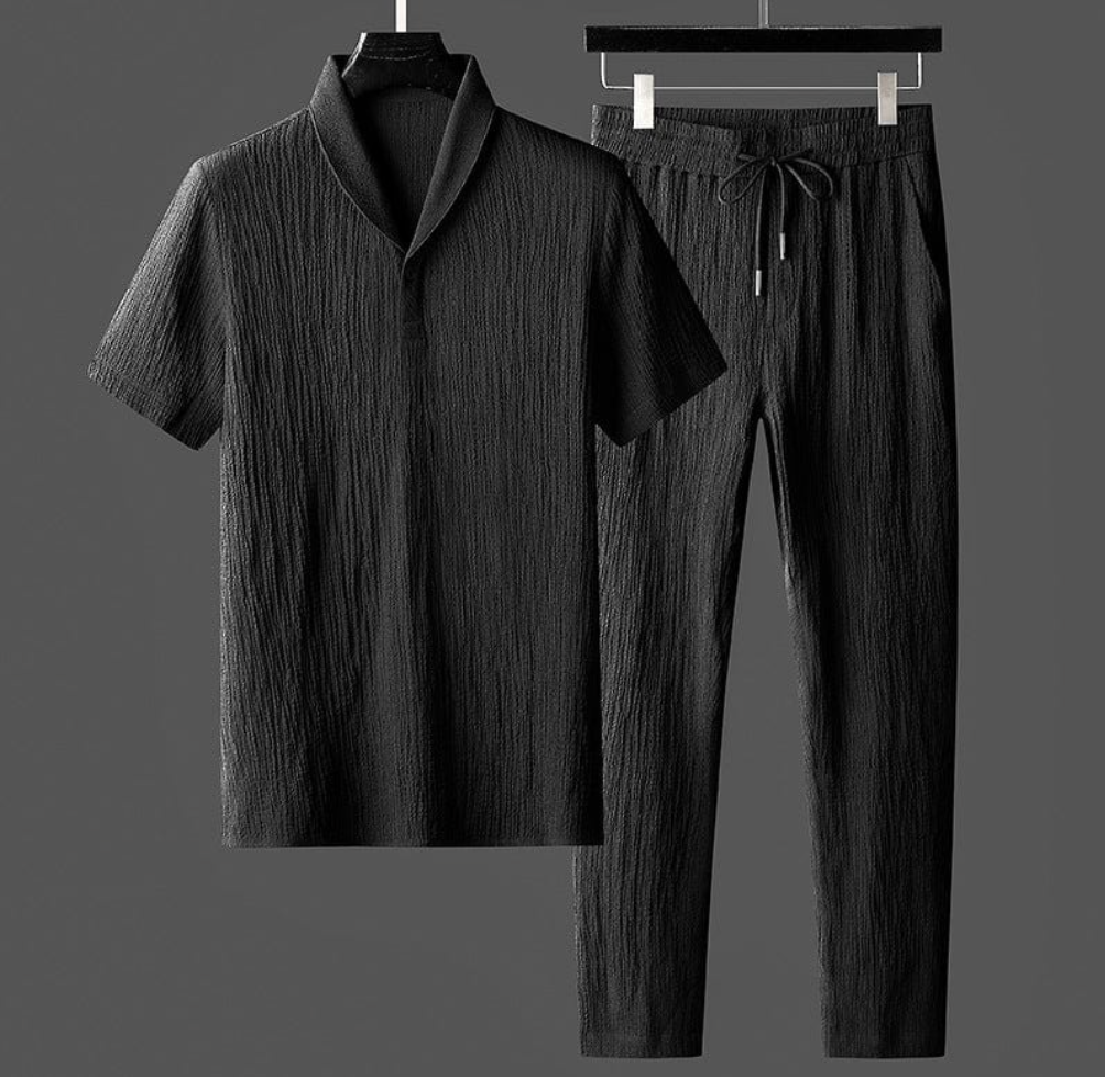 Setet består av en kortärmad skjorta med en stilren öppen krage och en ledig passform, samt ett par matchande byxor med elastisk dragsko i midjan för optimal komfort och enkel justering. Det unika crinklematerialet ger en subtil textur och en sofistikerad look som sticker ut.