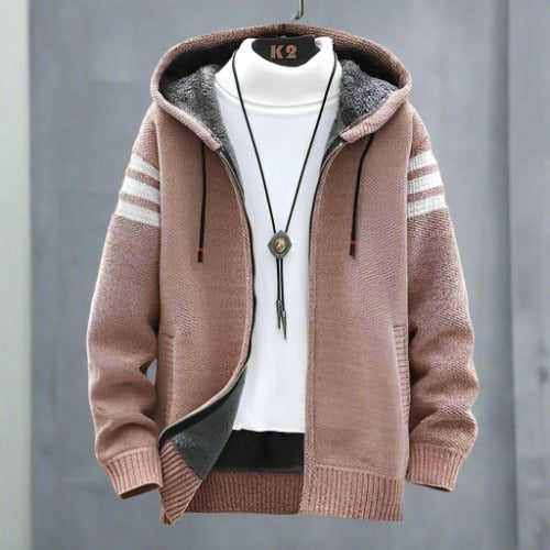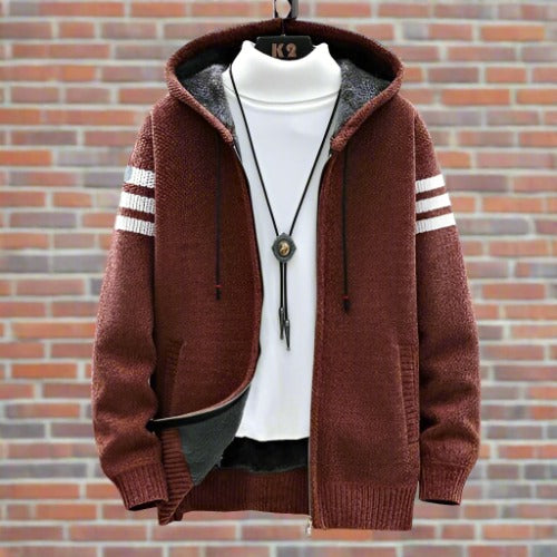 Herr Zip-Hoodie - Stickad Design - Fodrad för Komfort - Sportiga Ärmdetaljer. Denna stickade zip-hoodie kombinerar komfort med en sportig stil. Med dragkedja fram, fodrad insida och snygga detaljer på ärmarna är den perfekt för både vardag och aktivitet. Ett måste i varje mans garderob!