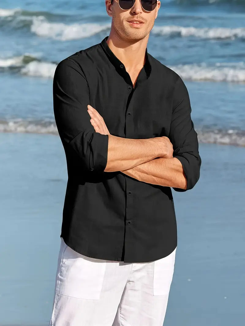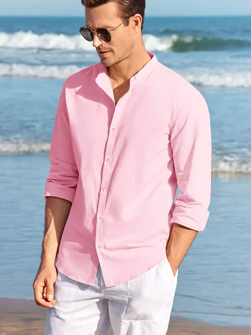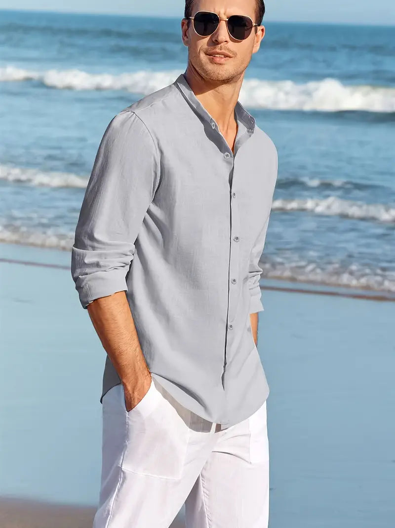 Uppgradera din garderob med Harald – en skjorta som kombinerar enkel elegans med en stor passform. Tillverkad av en förstklassig blandning av 70 % bomull och 30 % linne, erbjuder den en mjuk och andningsbar känsla, vilket gör den passar för vår- och höstdagar. Det stilrena, enfärgade designen och den sofistikerade mandarin kragen ger en modern touch till din look, oavsett tillfälle.