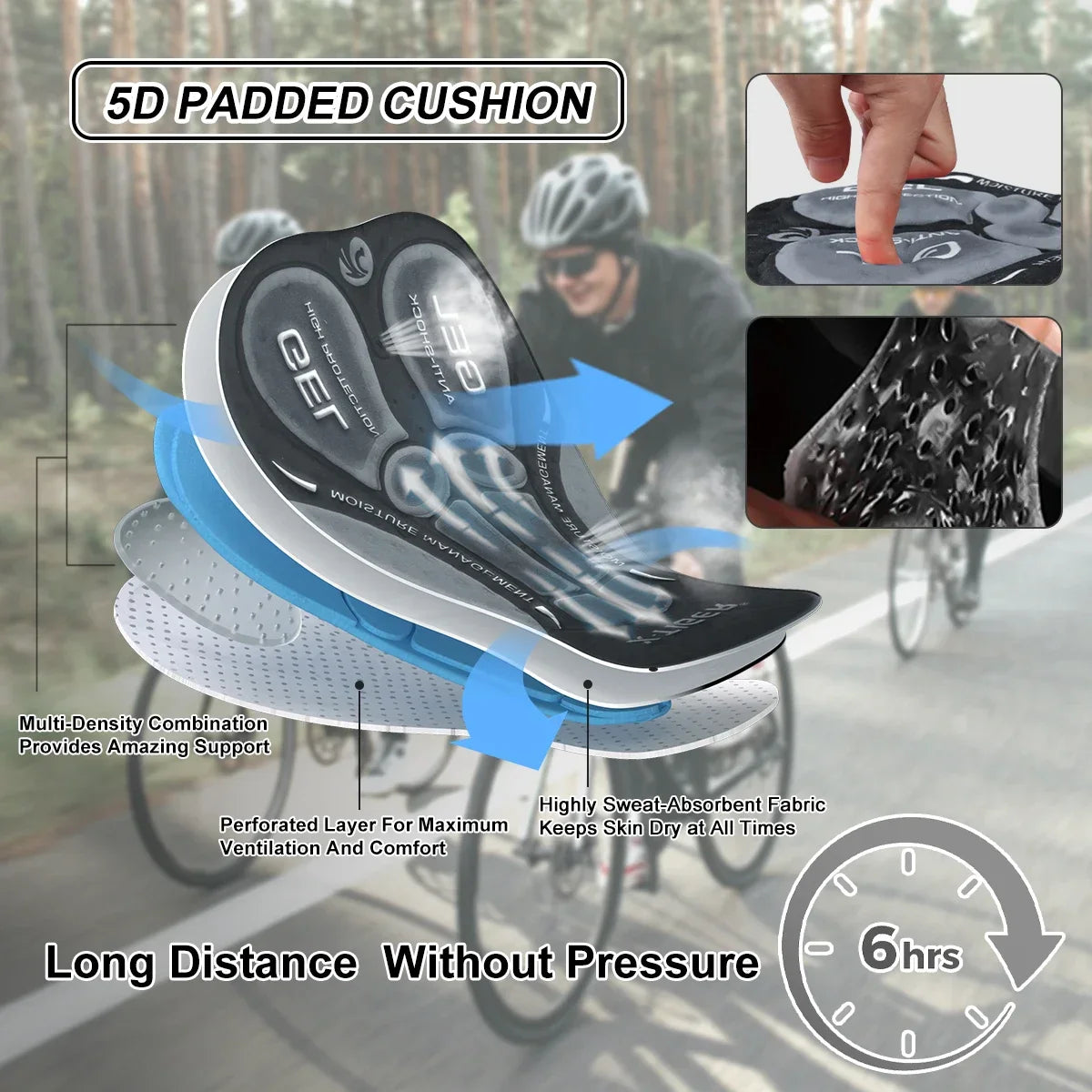 Byxorna är utrustade med en 5D gelkudde som ger utmärkt stötabsorbering och minskar påverkan från ojämna underlag, vilket förbättrar din cykelupplevelse.