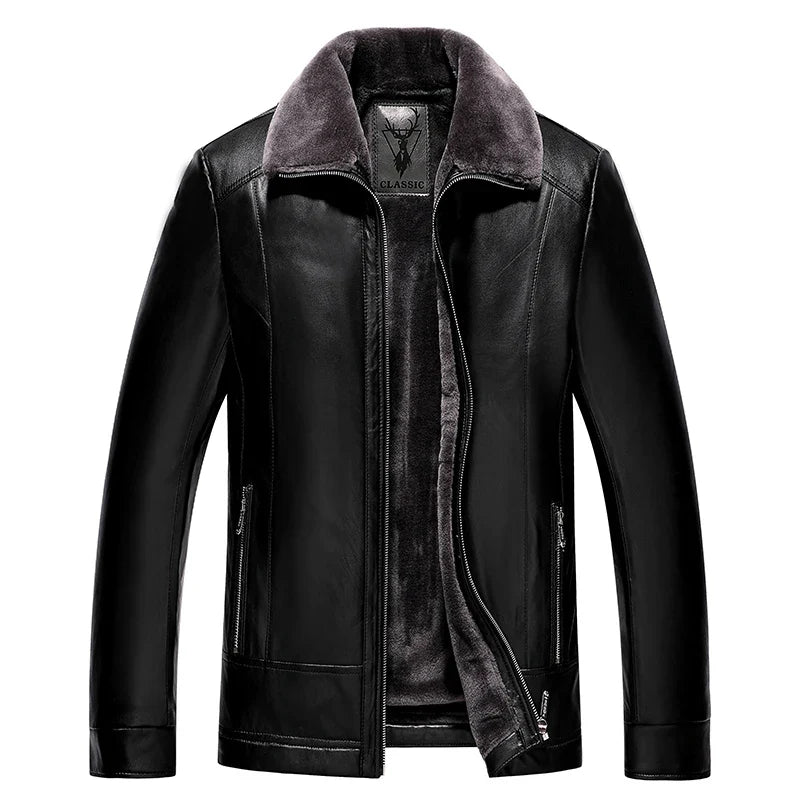 Herrskinnjacka med fleecefoder och tjock pälskrage