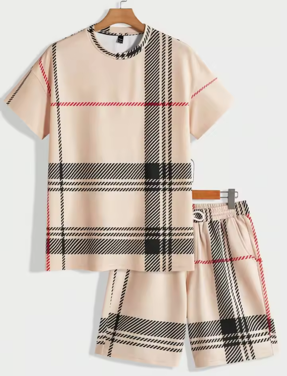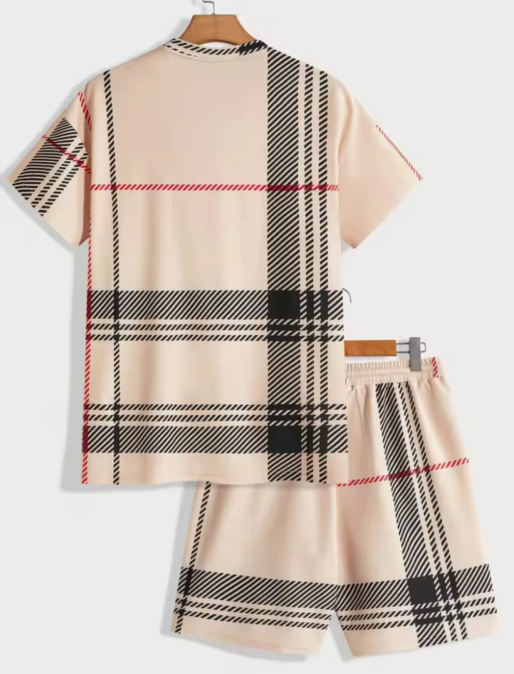 Ge din sommarstil en stilren och trendig uppgradering med detta tvådelade herrset i klassiskt rutigt mönster. Den kortärmade t-shirten med rund hals kombineras med matchande shorts med resårmidja och dragsko – perfekt för en avslappnad men välklädd look. Den beiga grunden bryts av svarta, röda och vita rutdetaljer som ger en lyxig känsla och modern attityd. Setet är tillverkat i ett mjukt och följsamt material som passar både strandpromenader och cityhäng.