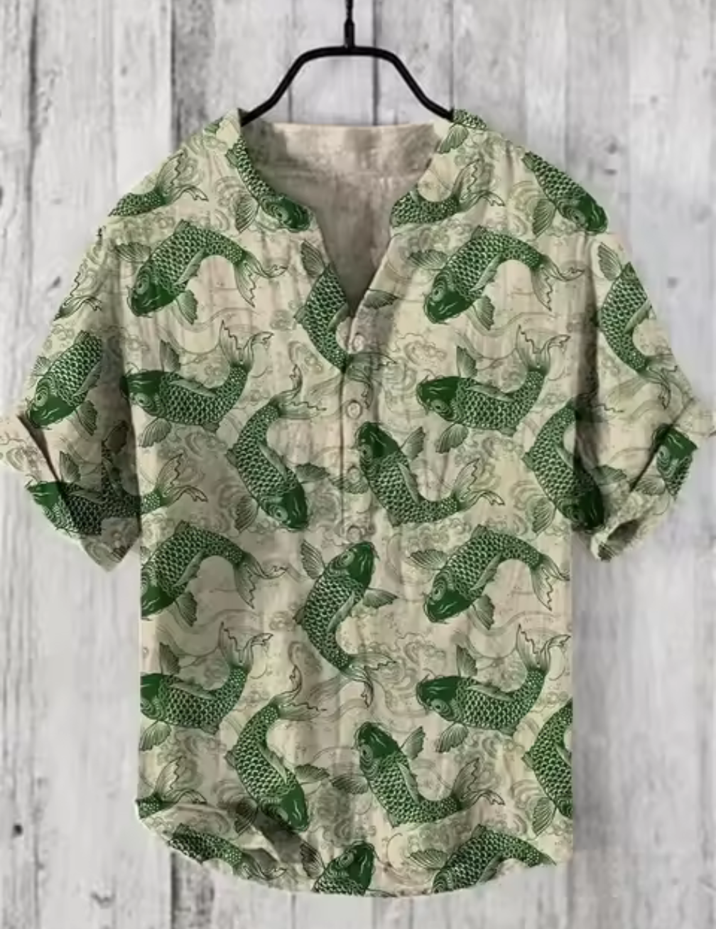 Stick ut med stil denna sommar i en skjorta som kombinerar konstnärlig elegans med modern komfort. Denna kortärmade herrskjorta är dekorerad med ett livfullt tryck av gröna koi-fiskar mot en diskret beige bakgrund, inspirerad av traditionell asiatisk estetik. Koi-fisken symboliserar styrka, framgång och balans – vilket gör denna skjorta till mer än bara ett modeval.