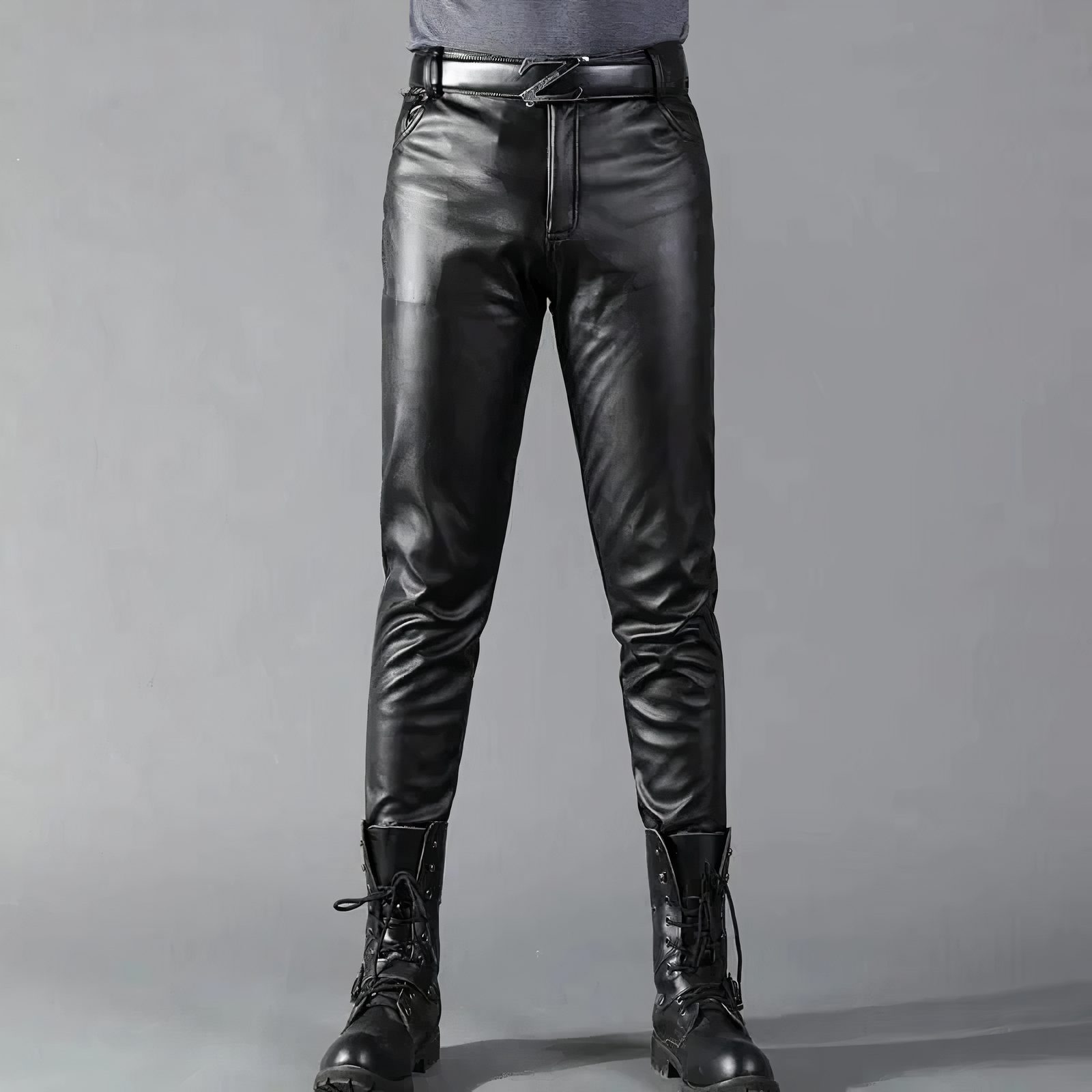 Upptäck en ny nivå av elegans med våra Kristofer svarta läderbyxor. Dessa byxor, tillverkade i konstläder, kombinerar modern design med hållbarhet, vilket gör dem stor för både avslappnade och stiliga tillfällen. Den smala passformen ger en slående silhuett och den lyxiga ytan gör ett varaktigt intryck.