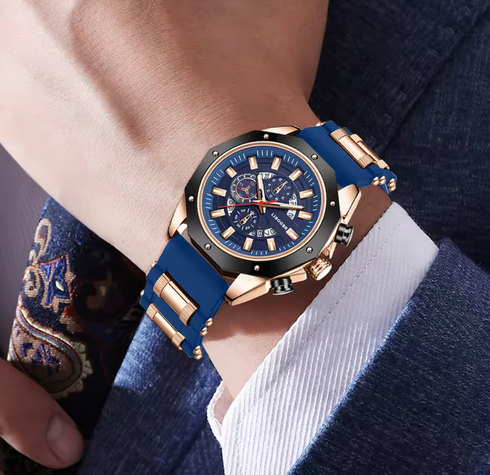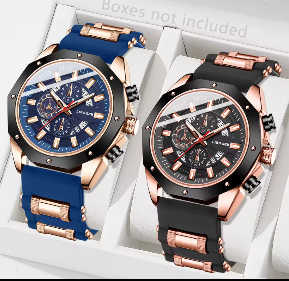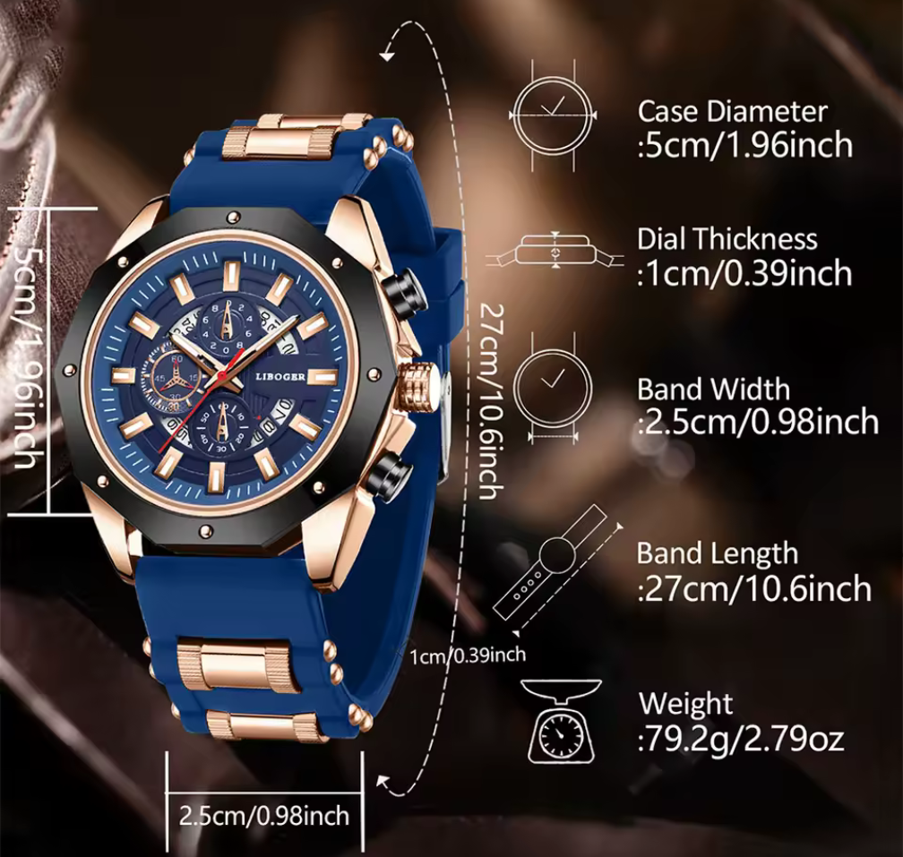 Kraftfull design möter sportig elegans i denna moderna herrklocka från LIBOGER. Med sin robusta urtavla på nästan 5 cm, markerade tidsindex och detaljer i roséguld sticker den verkligen ut – oavsett om du bär den till kostym eller hoodie. Den multifunktionella displayen ger en tydlig överblick över datum och tid, och de markerade kronograferna förstärker dess tekniska utseende. Klockan finns i två färgkombinationer: blå urtavla med blått silikonband eller svart urtavla med svart silikonband, båda med läckra detaljer i roséguld och svart.