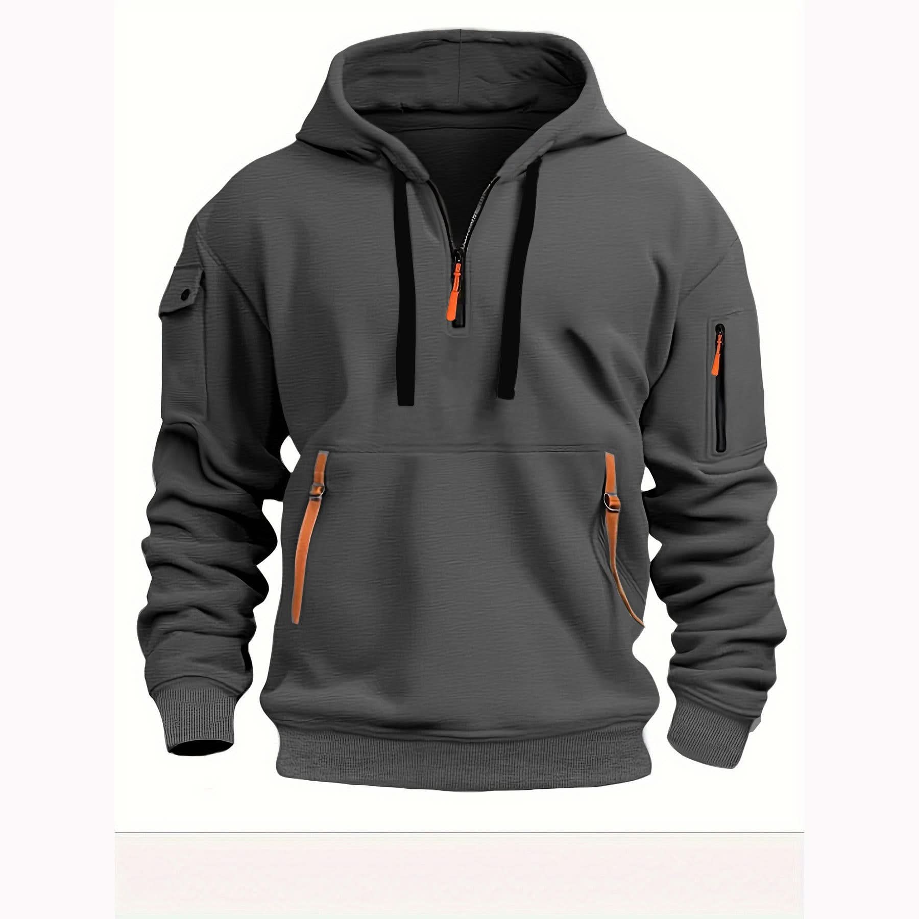 Men’s Hoodie - Halvdragkedja - Känguruficka med Dragkedja - Ribbad Kant - Avslappnad Passform