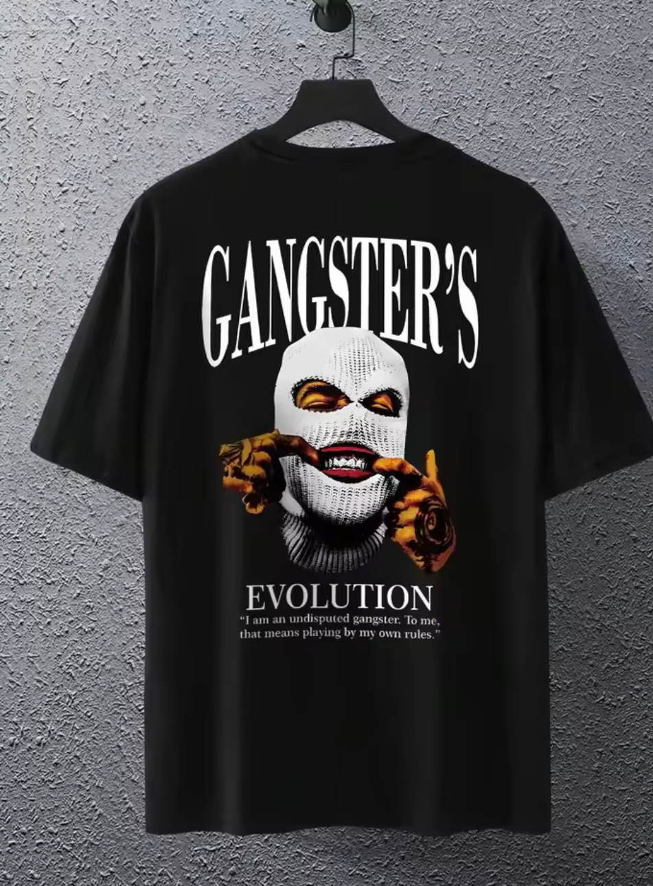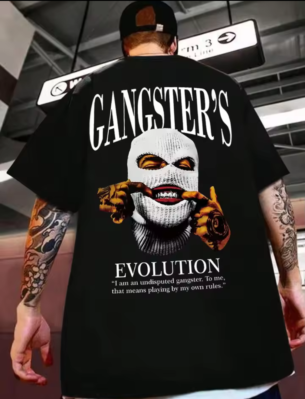 Denna oversized t-shirt är för dig som vill göra ett starkt intryck med attityd. Med ett stort gangstertryck på ryggen och en bild av en man i rånarluva utstrålar den självsäkerhet och edge. Designen är både snygg och trendig, perfekt för dig som vill ha en streetwear-inspirerad stil som sticker ut i mängden. Den avslappnade passformen ger en modern silhuett och gör t-shirten otroligt bekväm att bära. Tillverkad i högkvalitativt material som känns skönt mot huden och håller sig snygg tvätt efter tvätt. Ett måste bland nyheterna för dig som vill ha en kaxig look.Produktdetaljer:
