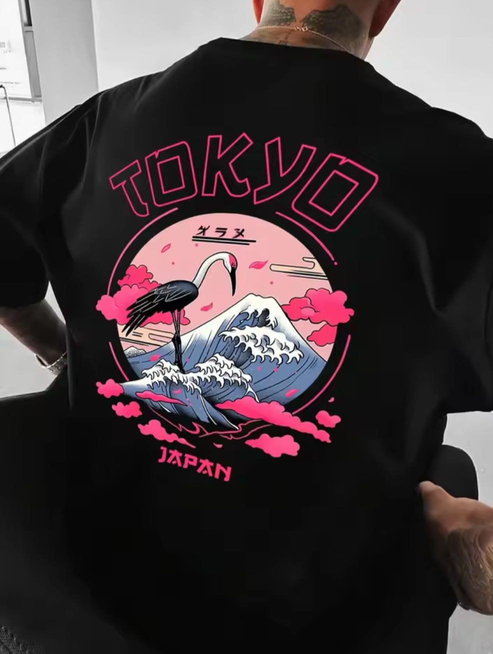 Inspirerad av japansk kultur och streetwear – denna oversized t-shirt är en perfekt mix av konst och mode. Det detaljerade ryggtrycket med våg, trana och neonfärger gör den till ett riktigt blickfång.