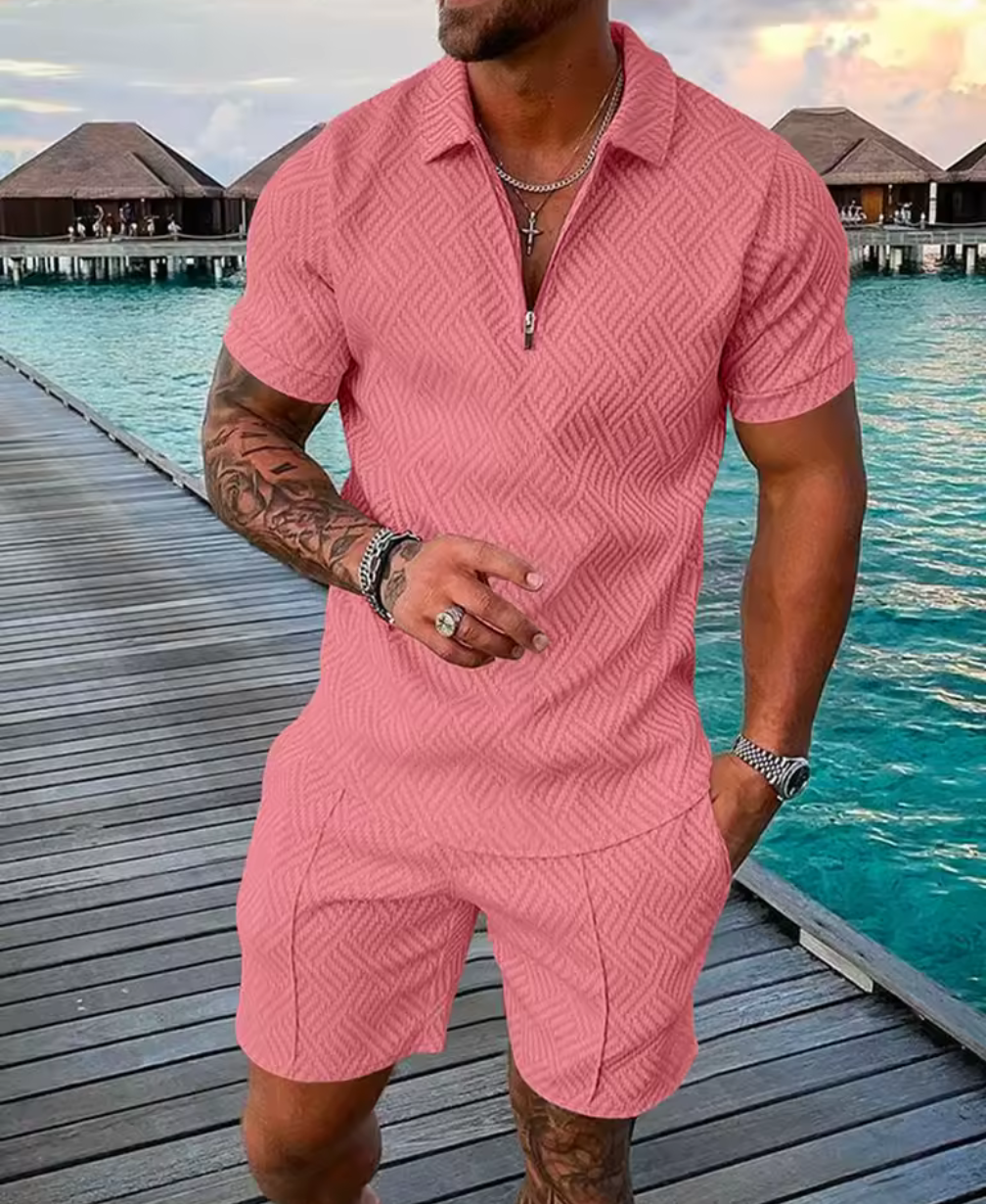 Stick ut i sommar med detta eleganta och trendiga tvådelade set i en snyggt mönstrad struktur. Den mjukt rosa färgen kombinerat med det unika geometriska mönstret gör att du ser både stilren och avslappnad ut – perfekt för strandpromenader, semesterdagar och sommarfester. Överdelen har en klassisk krage och halv dragkedja som ger dig friheten att styla efter humör, medan shortsen har en skön passform med praktiska fickor. Tillverkat i ett lätt, luftigt material som håller dig sval och bekväm hela dagen.
