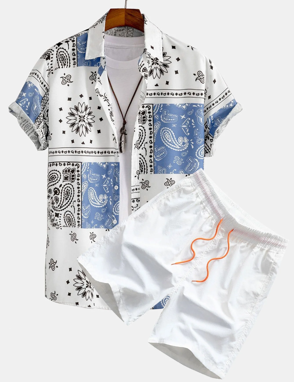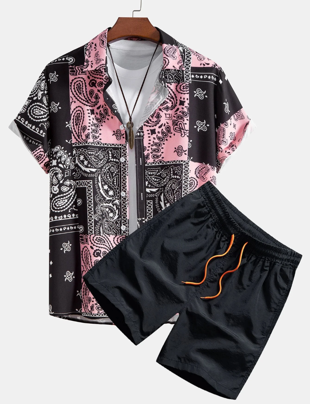 Ge din sommarlook en färgstark och trendig touch med detta tvådelade set i bandanainspirerat mönster. Setet består av en kortärmad skjorta i luftig kvalitet med coolt tryck i svart/rosa eller blå/vit, kombinerat med en klassisk vit t-shirt för en avslappnad lager på lager-effekt. Matchande shorts med bekväm resårmidja och kontrasterande dragsko gör outfiten komplett. Perfekt för semester, festival eller en dag på stan – snyggt, bekvämt och lätt att bära hela sommaren.
