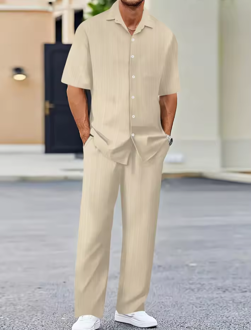 Upplev den perfekta balansen mellan komfort och elegans med detta tvådelade linne-set för män. Designat för en avslappnad men stilren look, passar det lika bra till vardags som till festligare tillfällen.