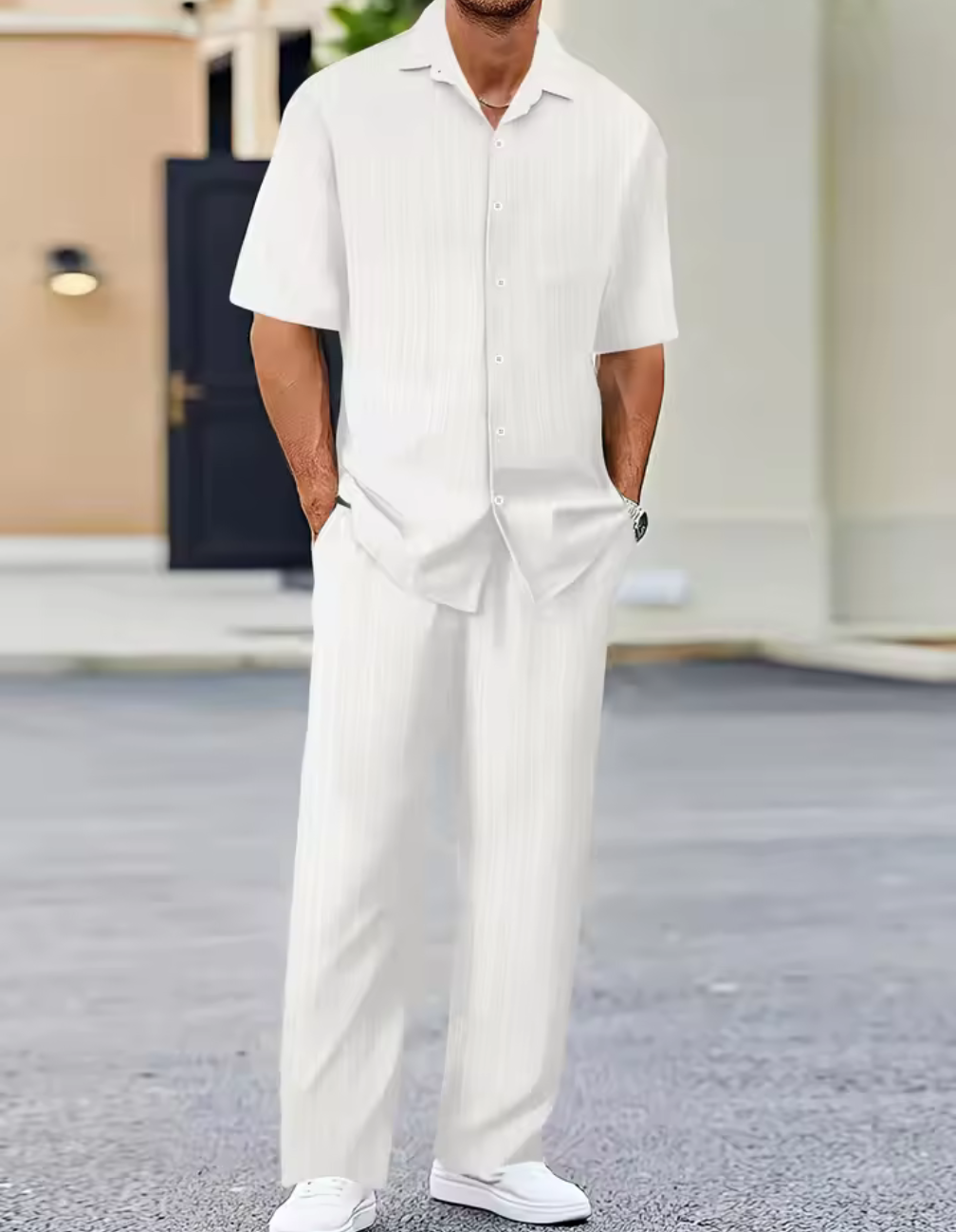 Upplev den perfekta balansen mellan komfort och elegans med detta tvådelade linne-set för män. Designat för en avslappnad men stilren look, passar det lika bra till vardags som till festligare tillfällen.