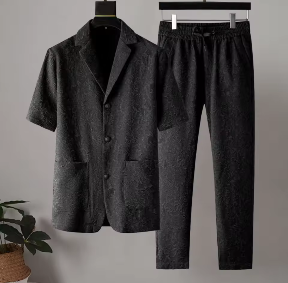 Ta sommaren med storm i detta eleganta herrset med exklusiv känsla. Det tvådelade setet kombinerar en kortärmad, kavajinspirerad skjorta med knappar och slag, tillsammans med ett par bekväma byxor i matchande tyg med dragsko i midjan. Det subtila, strukturvävda spetsmönstret ger en lyxig touch som drar blickarna till sig, utan att ta över. Perfekt för både semesterkvällar, events eller avslappnat citymode – och lika snyggt i vitt som i klassiskt svart.