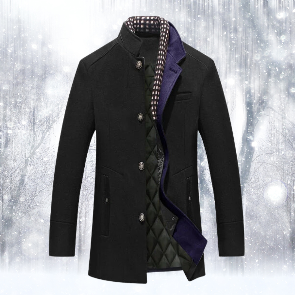 Herrkappa Skräddad - Varmfodrad Vinterjacka med Hög Krage. Upplev ultimat komfort och stil med Eva Janssons skräddarsydda herrkappa. Den höga kragen med knapp och varma quiltade foder håller dig varm i vinter. Perfekt för både vardag och fest!