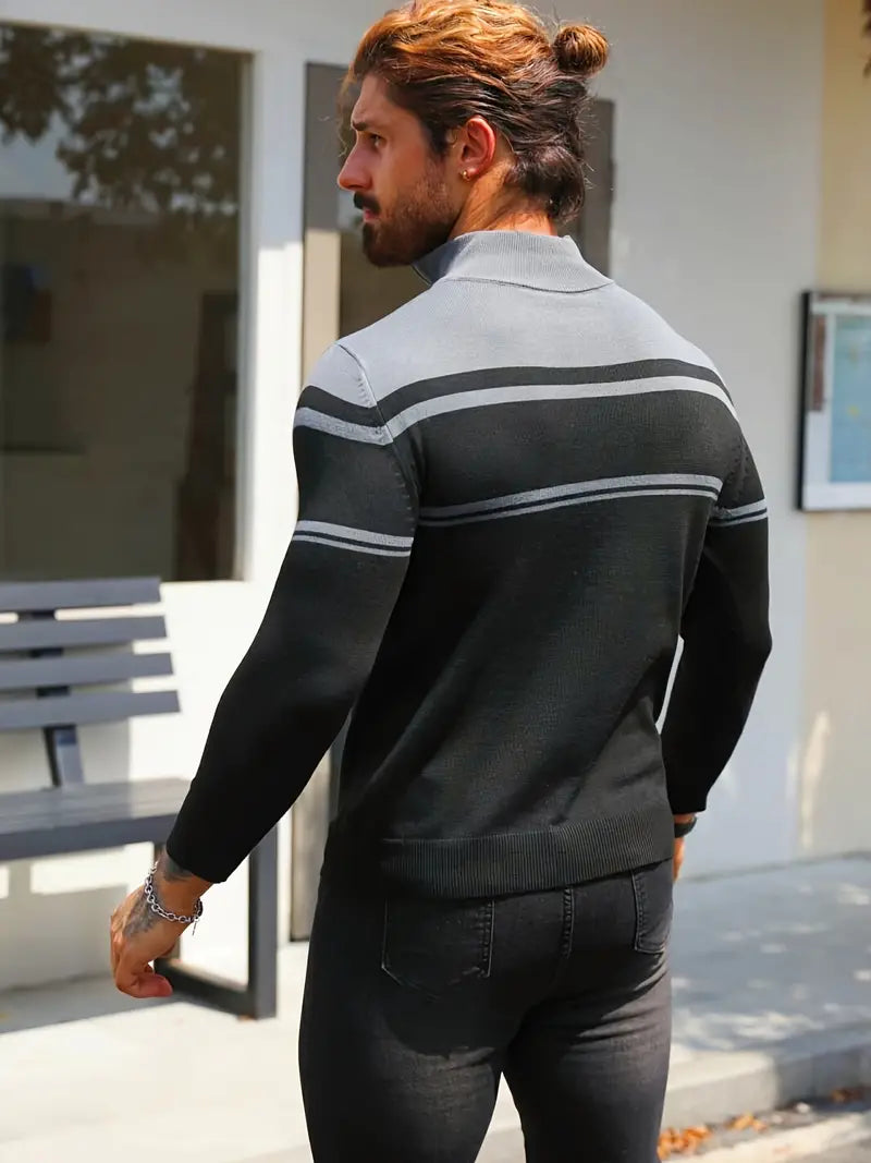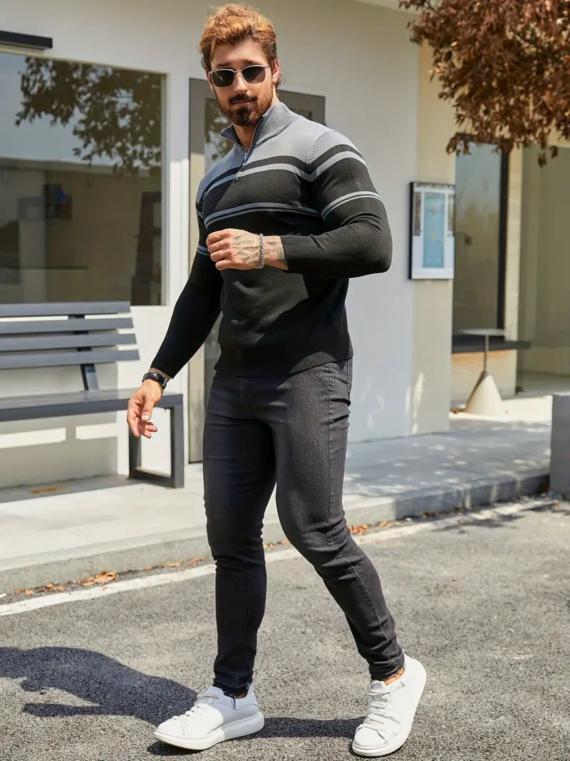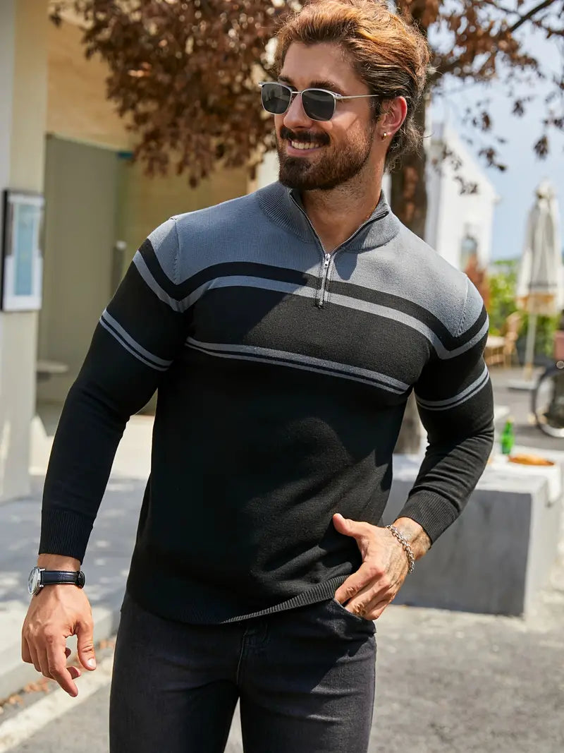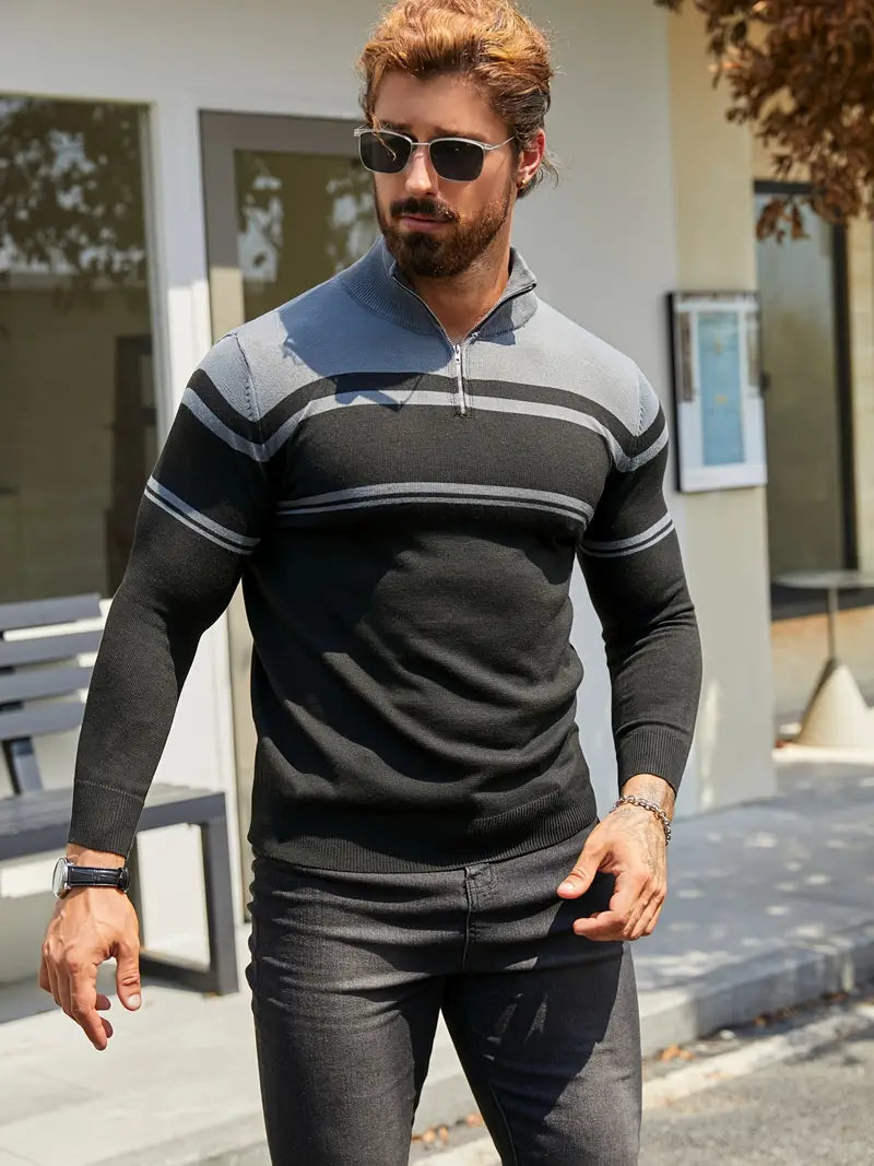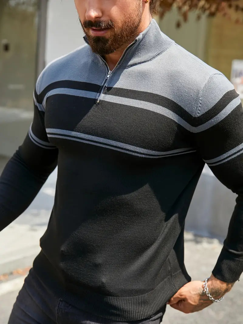 Trendig Blå Halvdragkedja Randig Tröja För Herr | Ideal för Höst/Vinter
