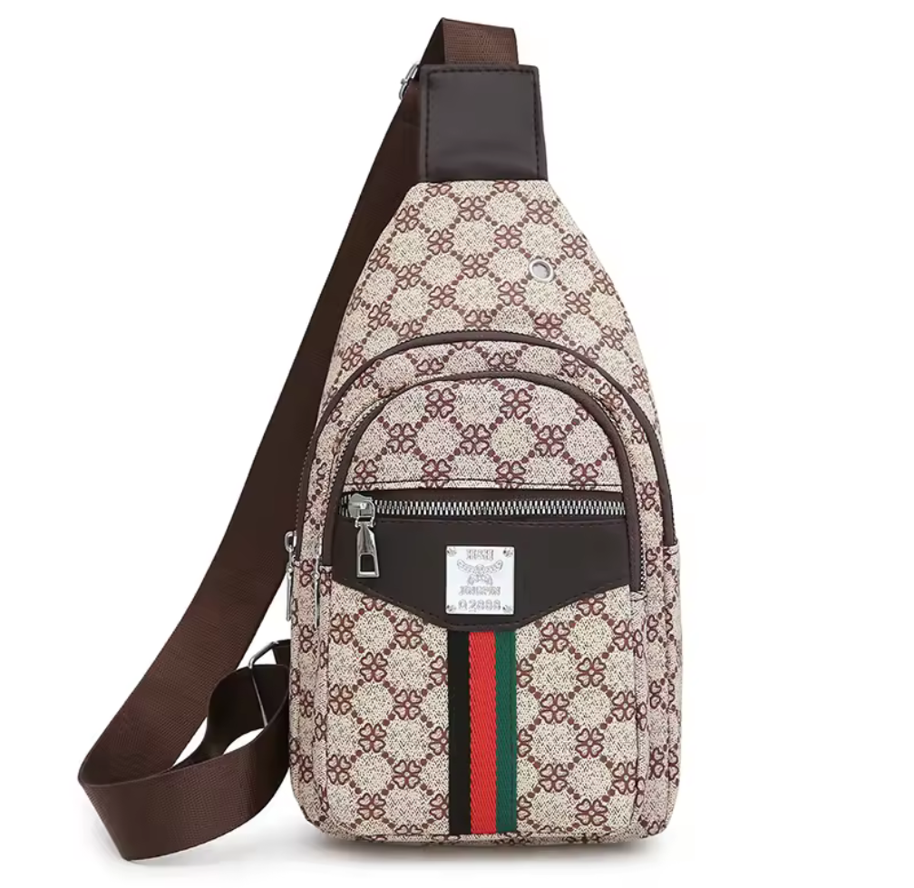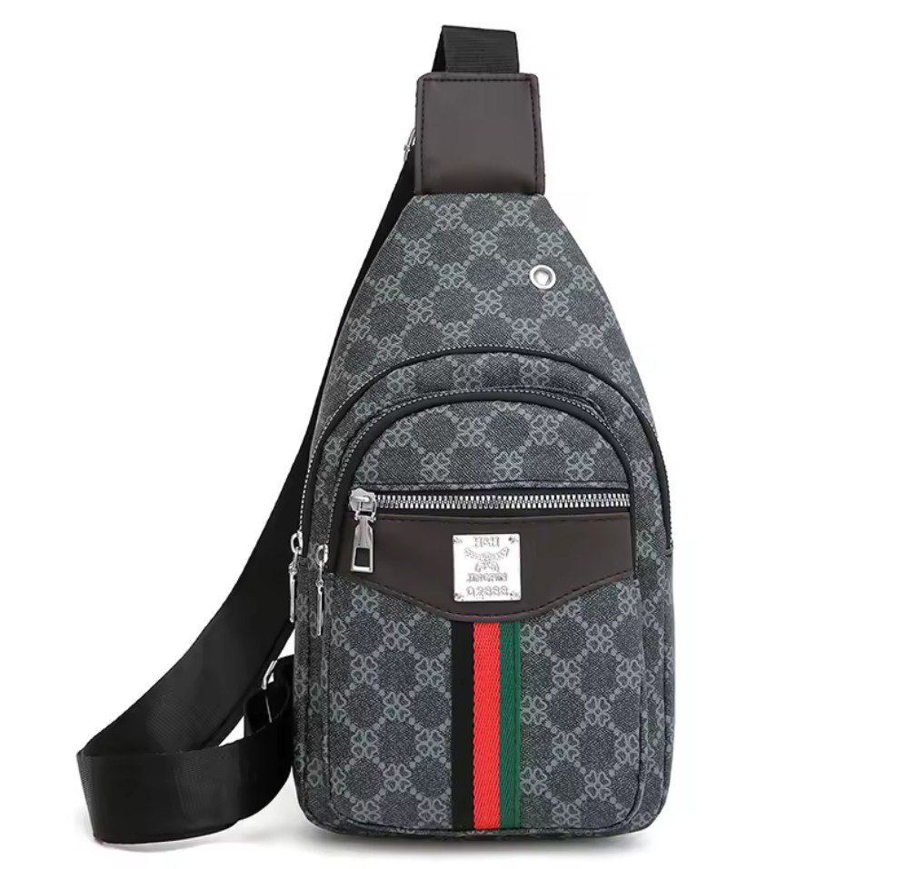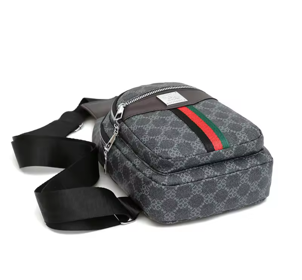 Ge din stil en uppgradering med denna exklusiva crossbody-väska i monogrammönster, designad för dig som vill kombinera funktion och mode. Den eleganta, något strukturerade ytan i slitstarkt konstmaterial pryds av ett tidlöst mönster, kompletterat med en bred, dekorativ rand i rött och grönt framtill – för en lyxig känsla. Väskan har ett justerbart axelband som gör det enkelt att bära den diagonalt över bröstet eller längs ena axeln, perfekt för både stadsvardagen och resor.