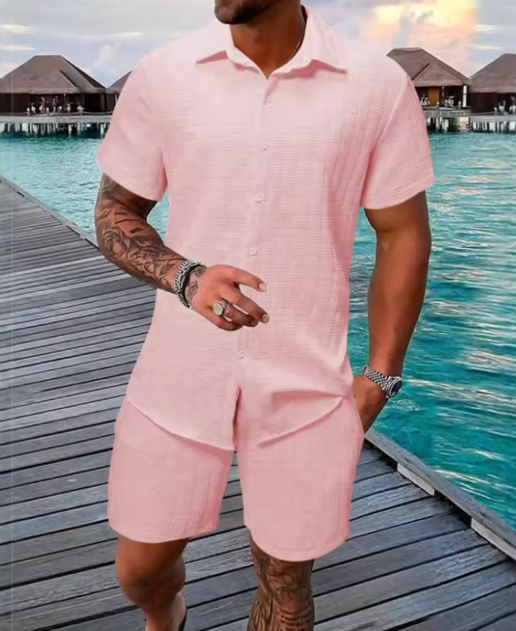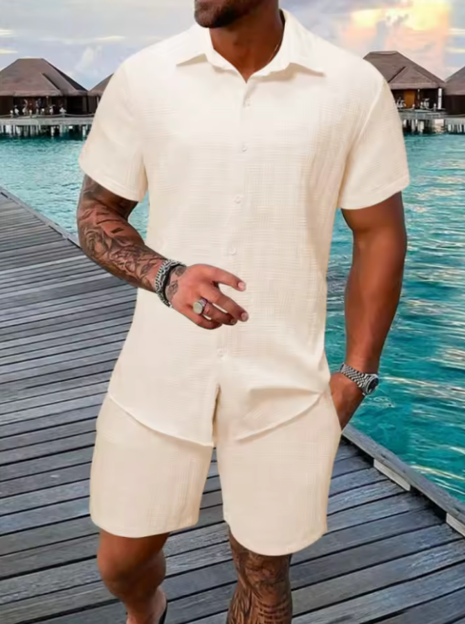 Uppgradera din sommarstil med vårt exklusiva tvådelade set för män, designat för dig som vill kombinera en avslappnad look med ett välklätt intryck. Setet består av en kortärmad skjorta och matchande shorts – perfekta för både strandpromenader, cityhäng eller sommarens fester.