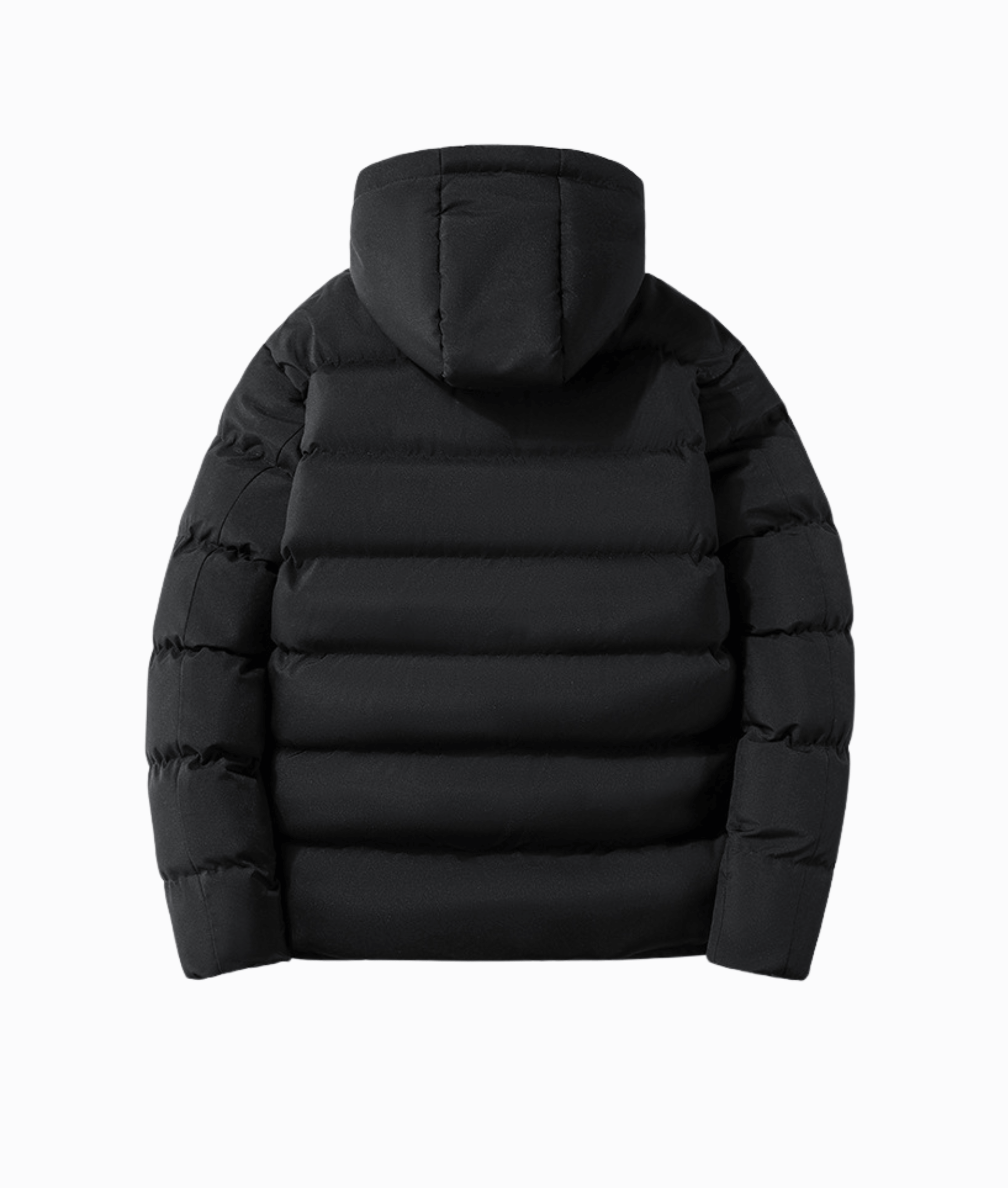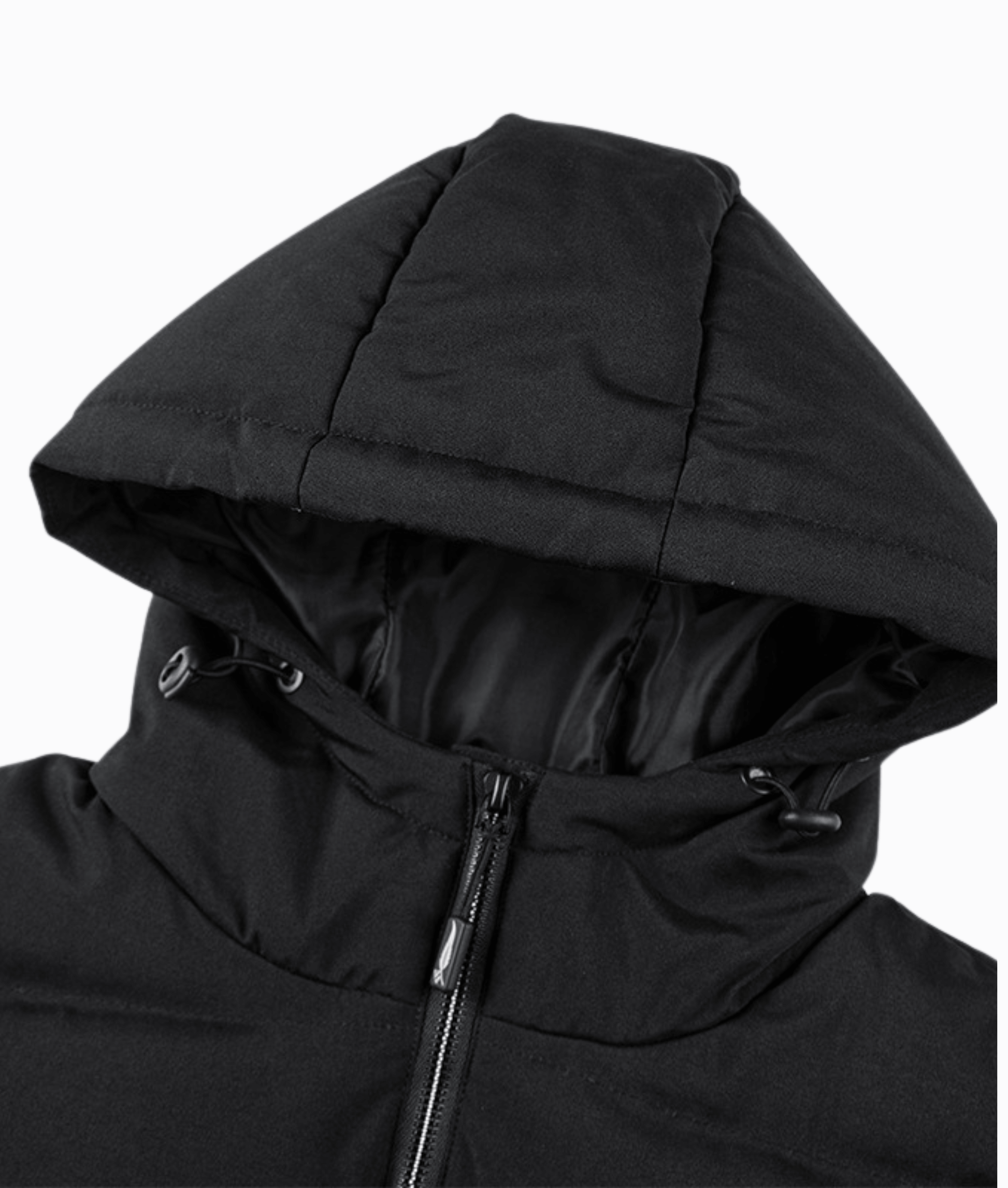 The jacket has a front zipper, a hood for extra protection against the cold and is filled with polyester fiber, making it both warm and comfortable for the winter months.