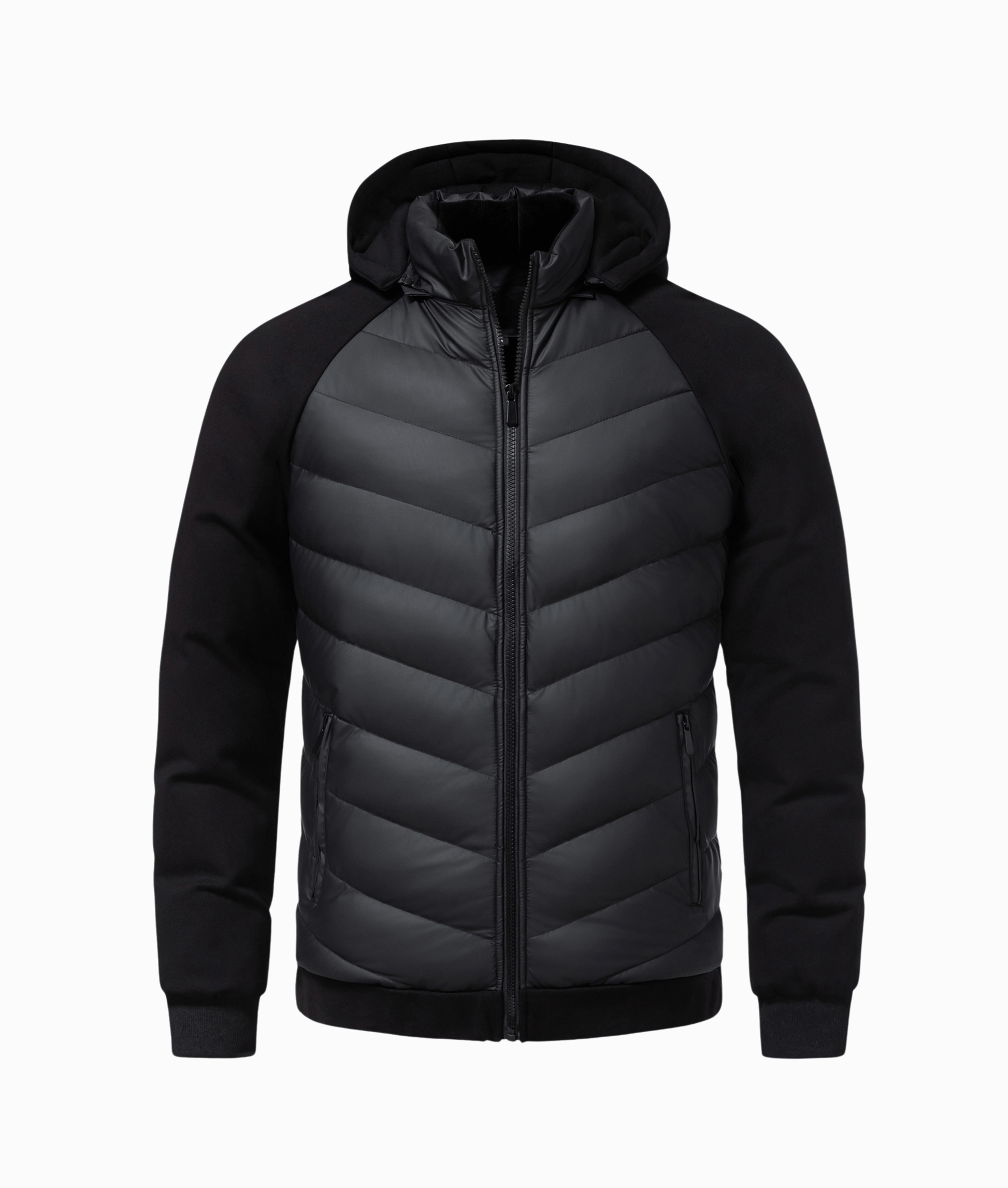 The outer material is made of PU and the lining is made of polyester, which provides warmth and durability. The jacket has a hood, stand-up collar, and full front zipper.