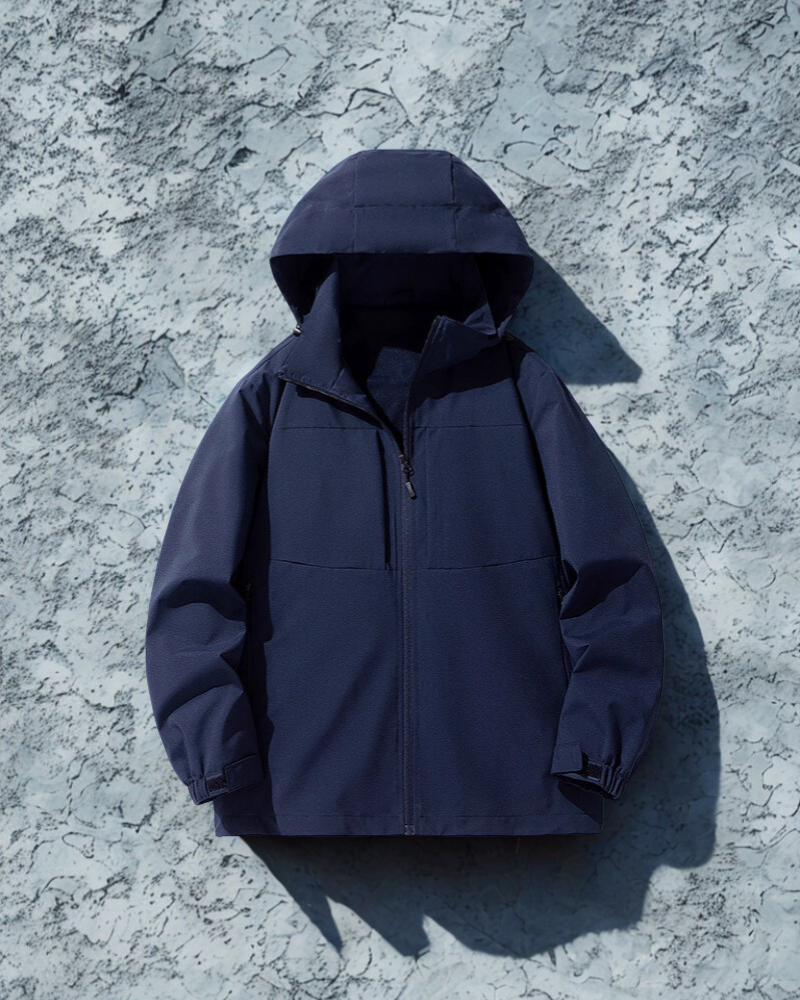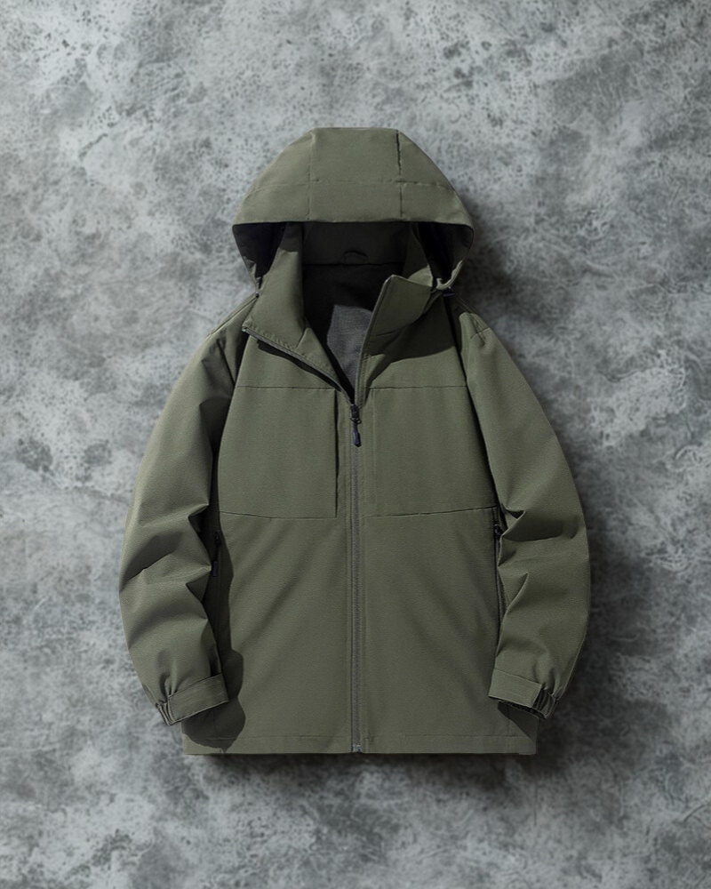 - Design: Avslappnad passform med huva, justerbara muddar och flera dragkedjeförsedda fickor för optimal funktion.