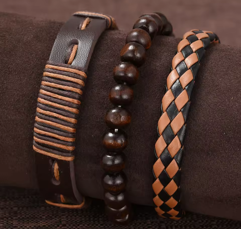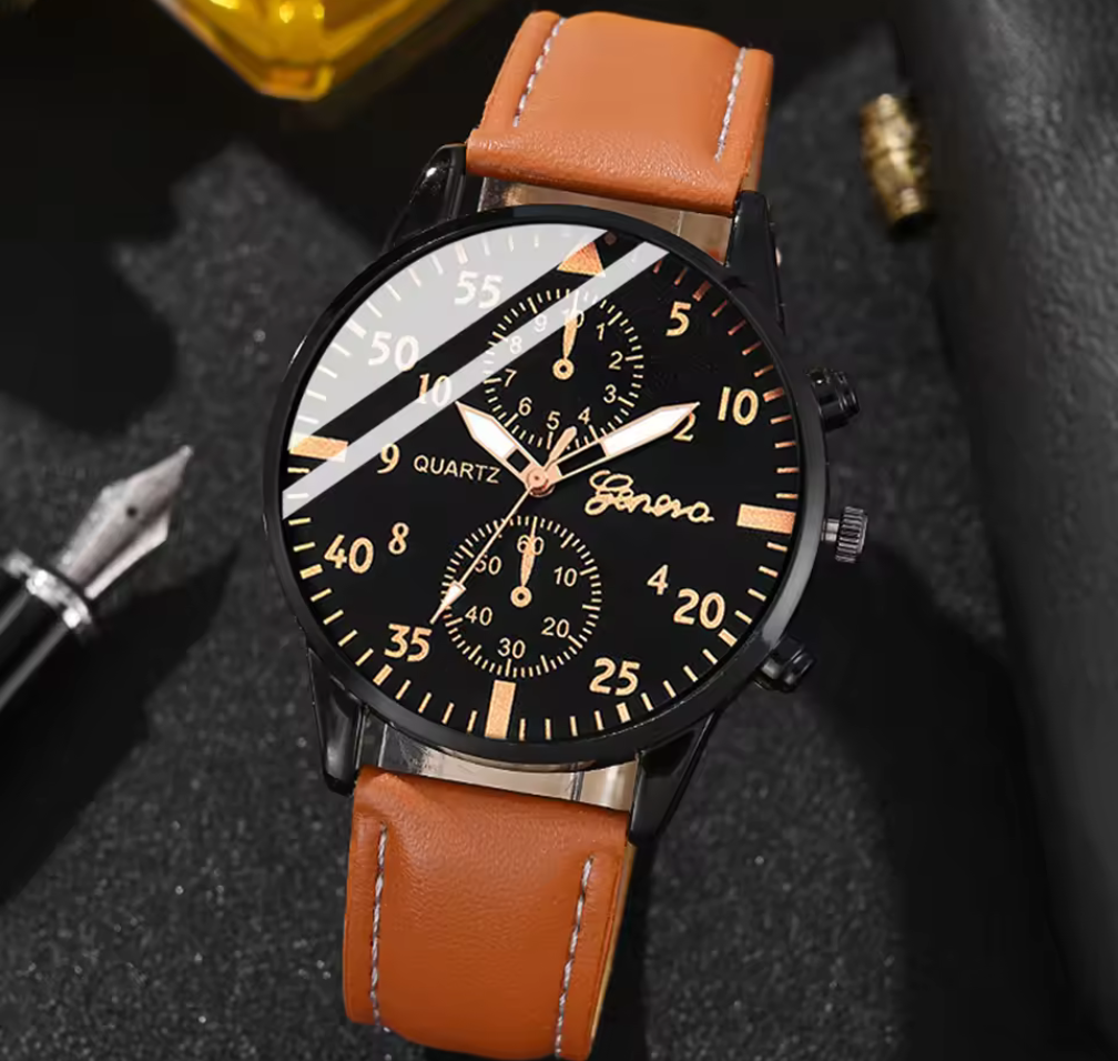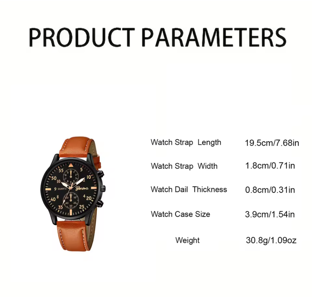 Ge din stil ett lyft med detta stilrena klockset som kombinerar klassisk design med moderna detaljer. Den bruna klockan med svart urtavla i minimalistisk sportstil matchas perfekt med tre accessoarer: ett flätat läderarmband i brunt och svart, ett pärlarmband i trälook samt ett justerbart brunt läderarmband med tvinnad dekortråd. Urtavlan har falska kronografer för en lyxigare känsla, och det bruna konstläderbandet gör klockan bekväm hela dagen.