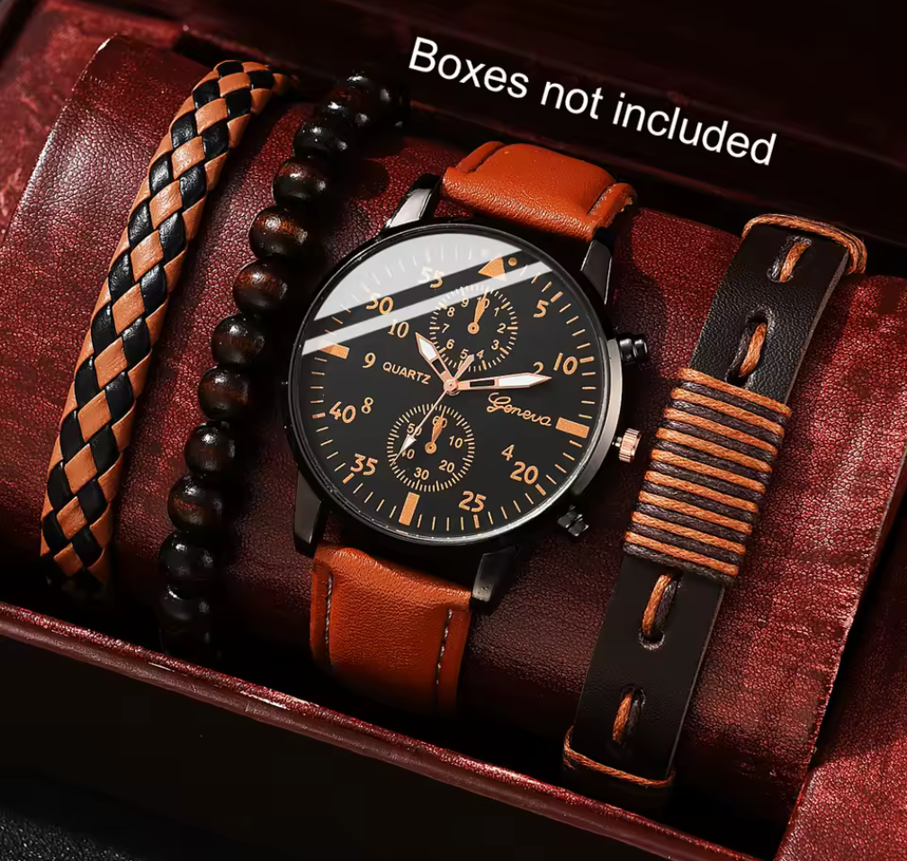 Klockset i brun och svart med matchande armband – 4-i-1 herraccessoar
