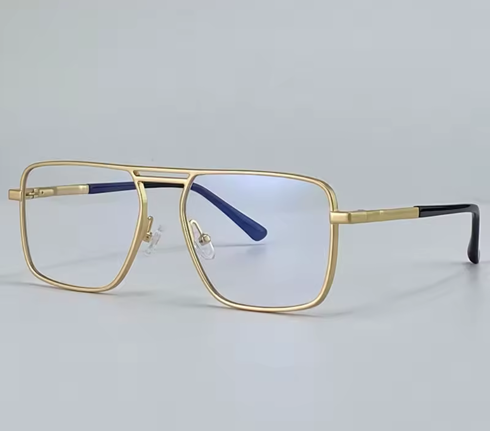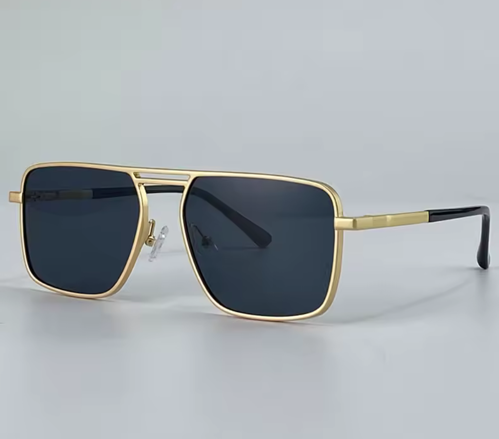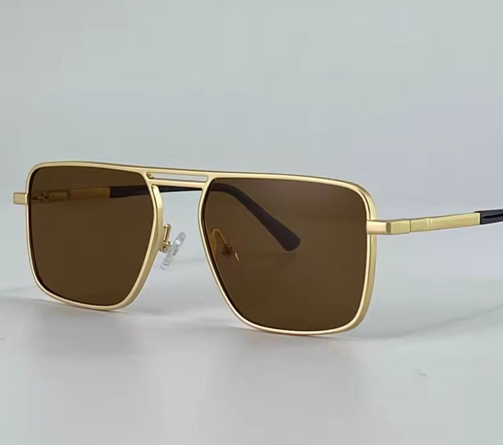 Ge din stil en kraftfull och elegant touch med dessa pilotinspirerade fyrkantiga solglasögon. Med en exklusiv metallbåge i guldfinish och ett unikt dubbelt näsbryne får du en sofistikerad look som passar både till vardags och vid mer uppklädda tillfällen.